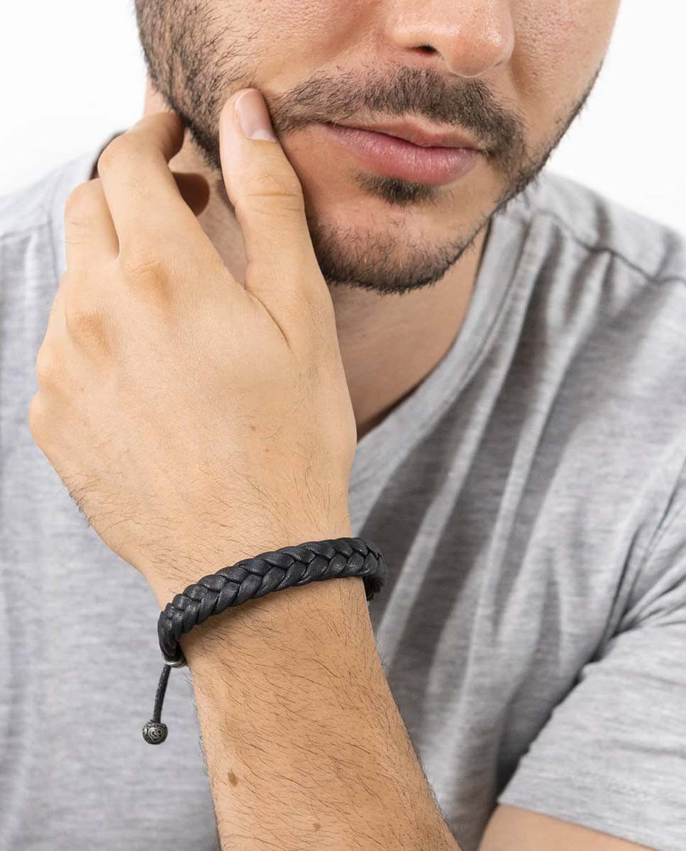 Pulsera trenza romana de cuero negro y acero inoxidable