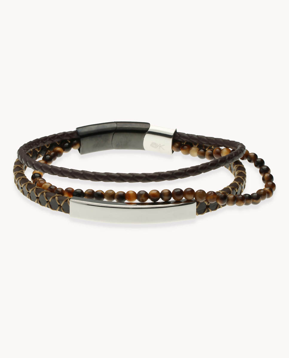Pulsera de acero inoxidable triple: cuero trenzado marrón, cuero liso marrón con detalle de nylon camel y placa central de 40 mm x 6 mm (ancho por alto) y piedra natural de Ojo de Tigre, largo de 20,5 cms a 21,5 cms y cierre de imán en IP negro y acero con una pieza extraíble.