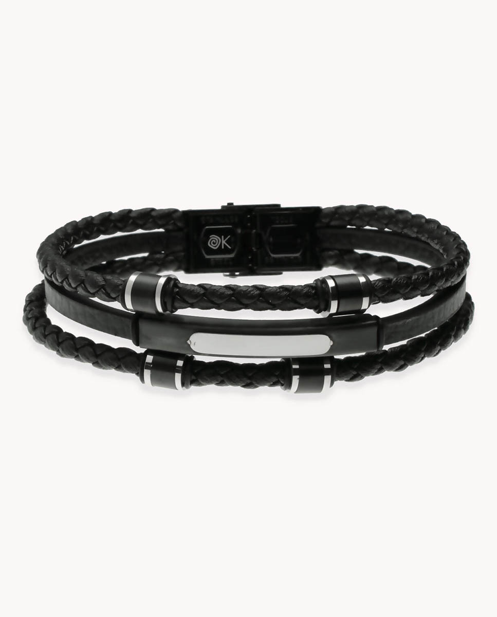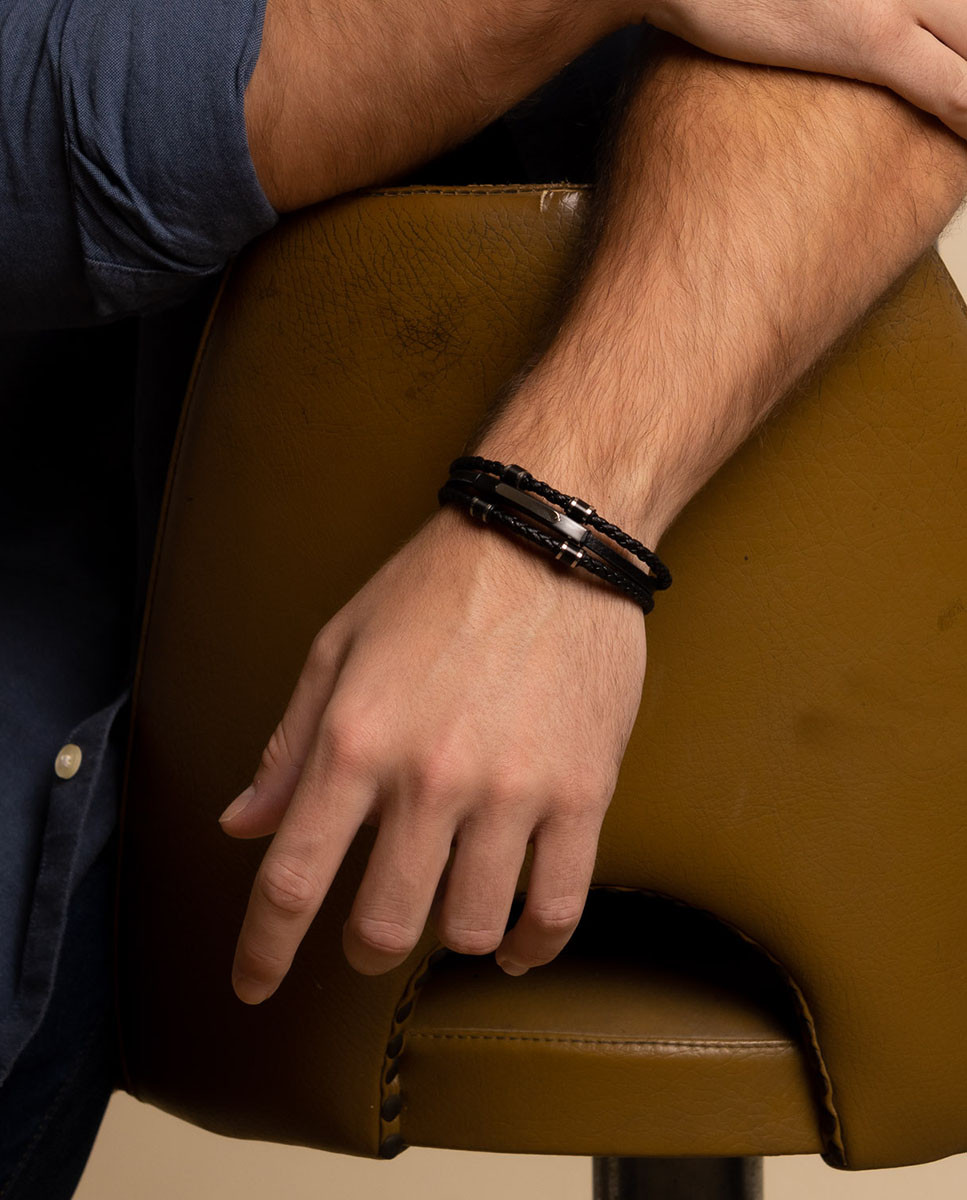 Pulsera de acero inoxidable de cuero negro con tres tiras en diferentes acabados, entrepiezas de acero e IP negro y placa central de acero negro de 37 mm x 5 mm (ancho por alto) con placa sobrepuesta de 22 mm x 3 mm (ancho por alto), 20,5 cms de largo y cierre regulable.