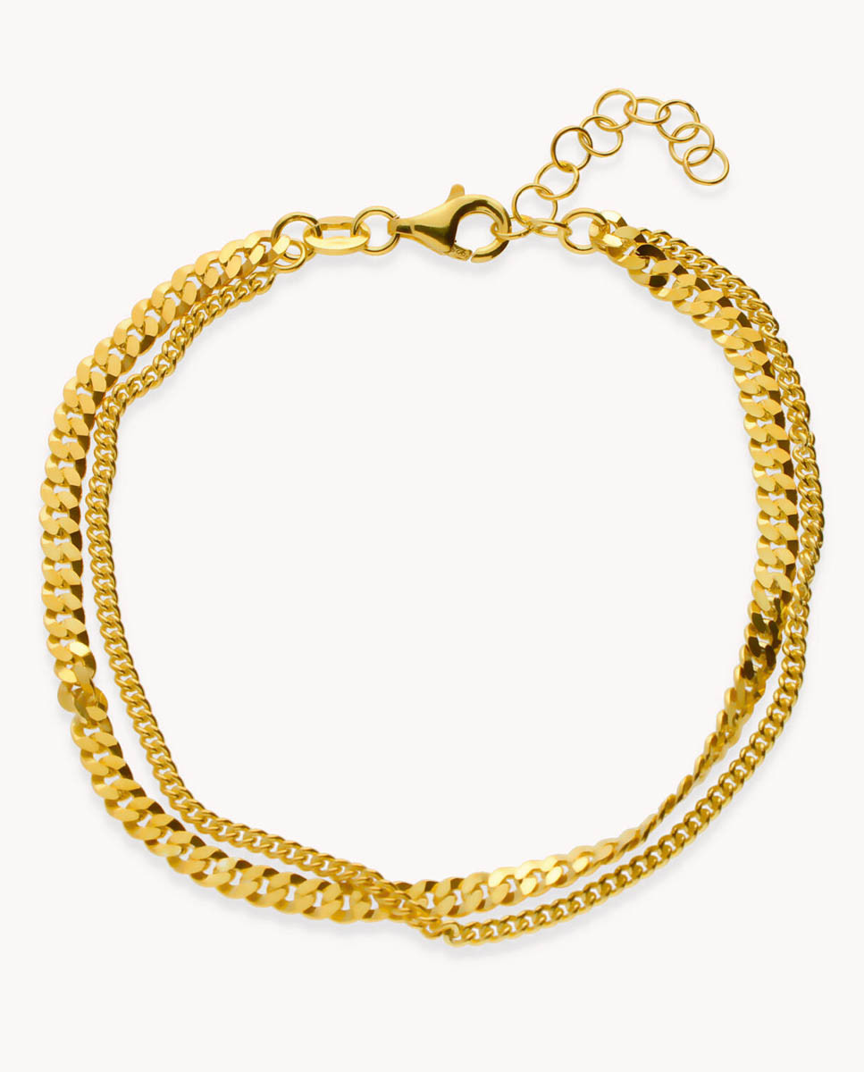 Pulsera doble de plata de ley 925 bañada en oro 18k con eslabón tipo barbado de 3 mm y 2 mm de ancho, largo de 17 cms más 3 cms de alargador y cierre de mosquetón.