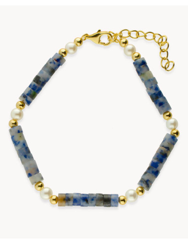 Pulsera de plata de ley 925 bañada en oro 18k con piedras naturales de Labradorita y perlas cultivadas de 4 mm de diámetro, largo de 16,5 cms más 4 cms de alargador y cierre de mosquetón.
