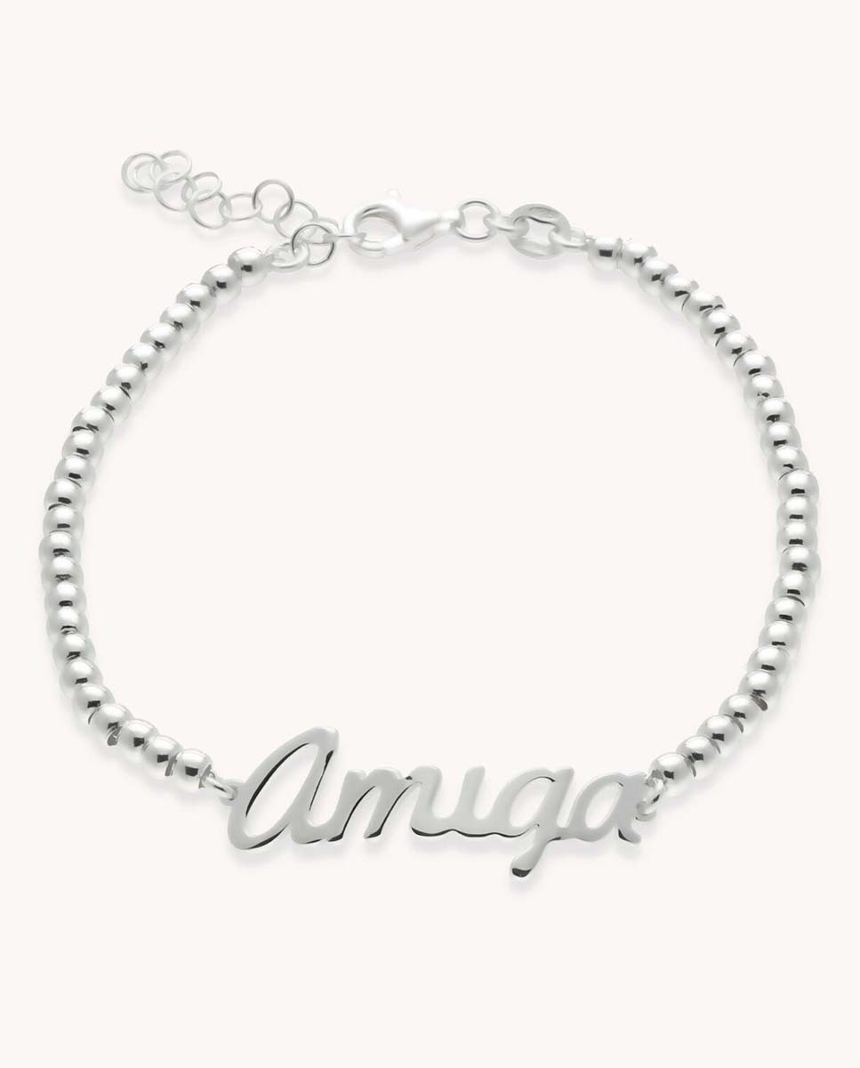 Pulsera de plata de ley 925 con cadena de bolas y motivo central Amiga , largo de 17 cms más 3 cms de alargador y cierre de mosquetón.