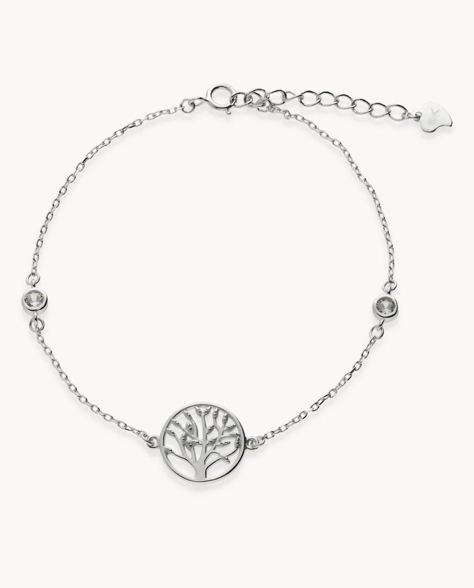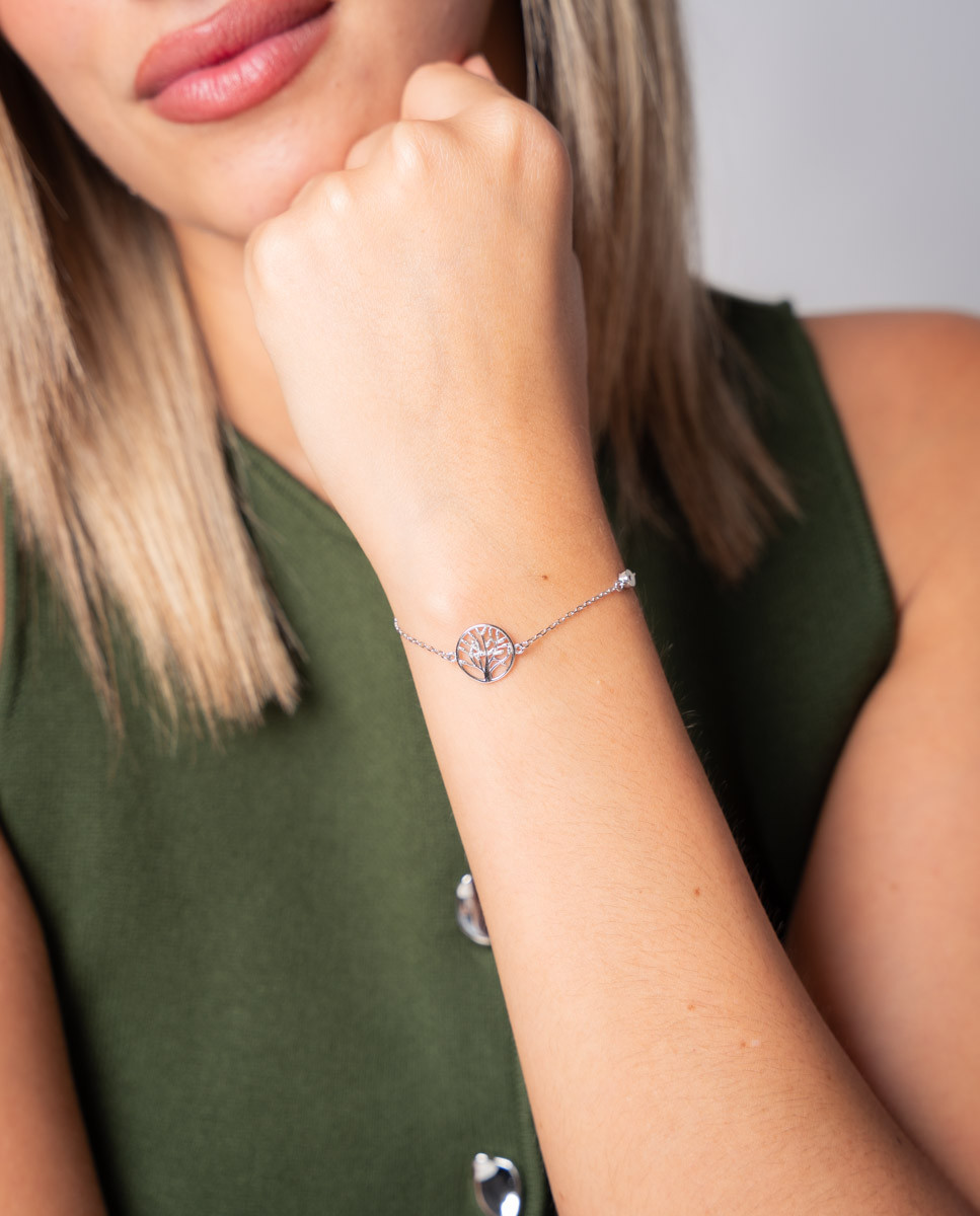 Pulsera de plata de ley 925 bañada en rodio con árbol de la vida central de 12 mm de diámetro y circonitas a ambos lados de 4 mm de diámetro, cierre tipo reasa y largo de 17,5 cms más 2,5 cms de alargador.