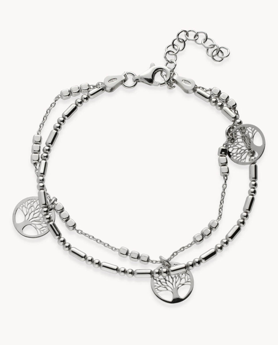 Pulsera de plata de ley 925 bañada en rodio con doble cadena y tres colgantes de árboles de la vida de 10 mm de diámetro, largo de 15,5 cms más 3 cms de alargador y cierre de mosquetón.