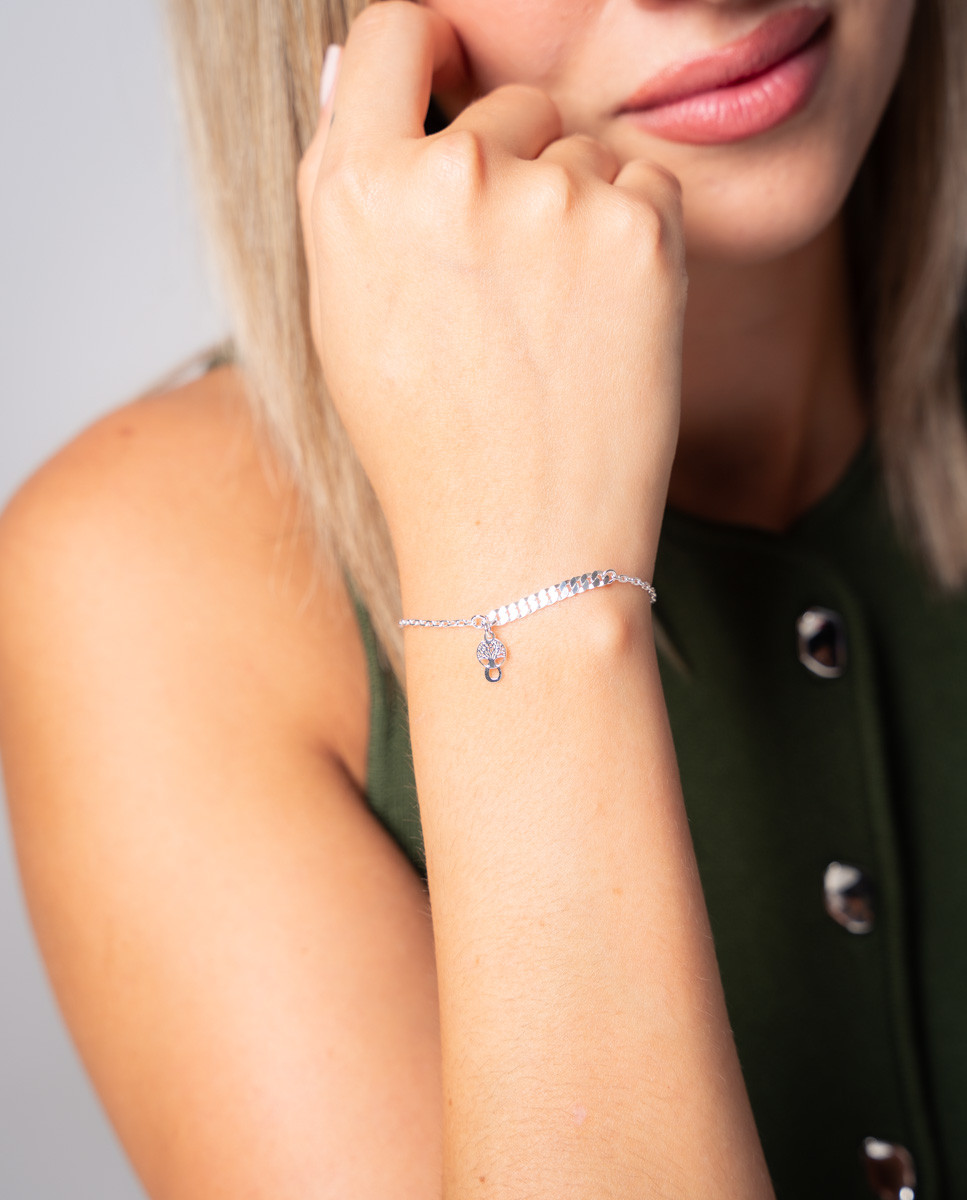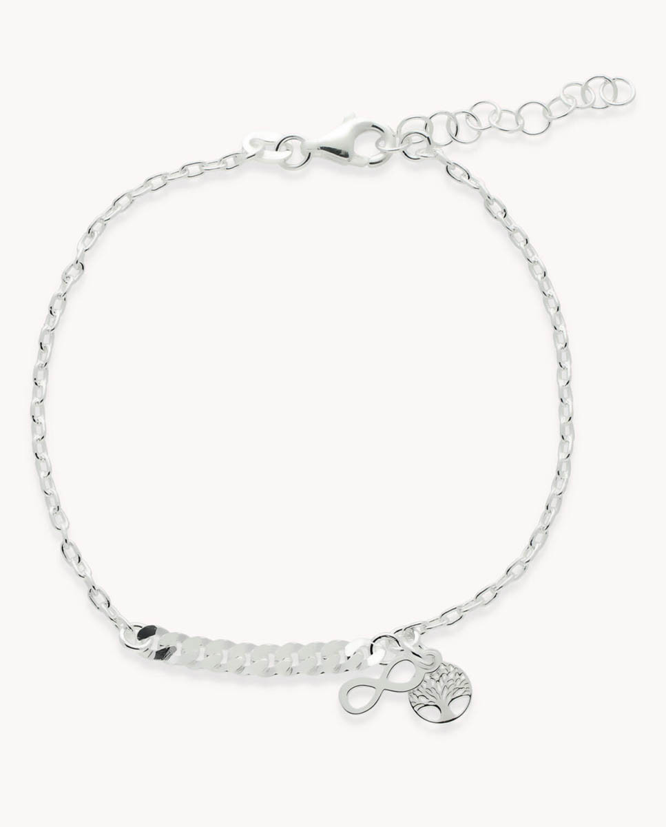 Pulsera de plata de ley 925 con colgante central de infinito y árbol de la vida, largo de 17 cms más 3 cms de alargador y cierre de mosquetón.