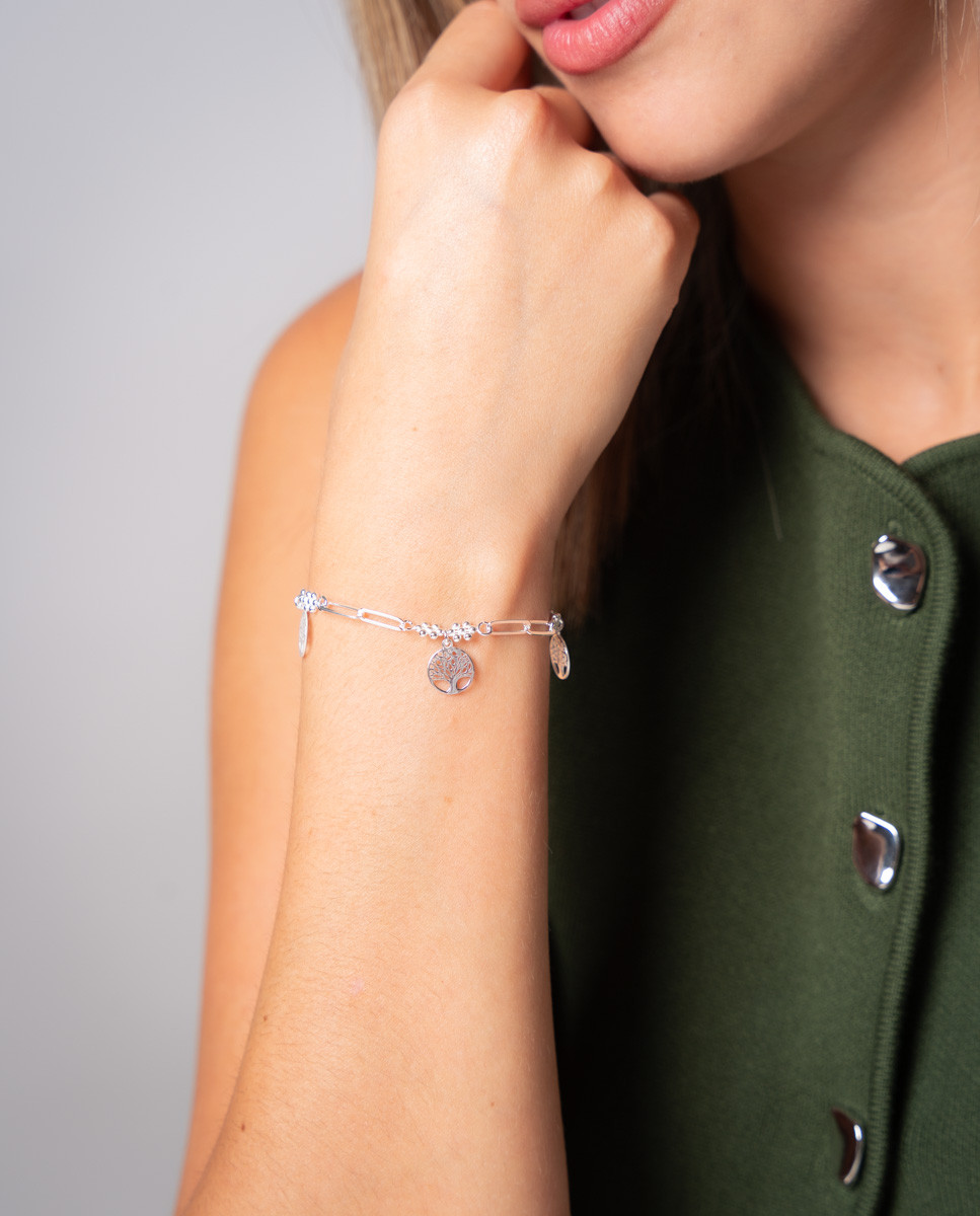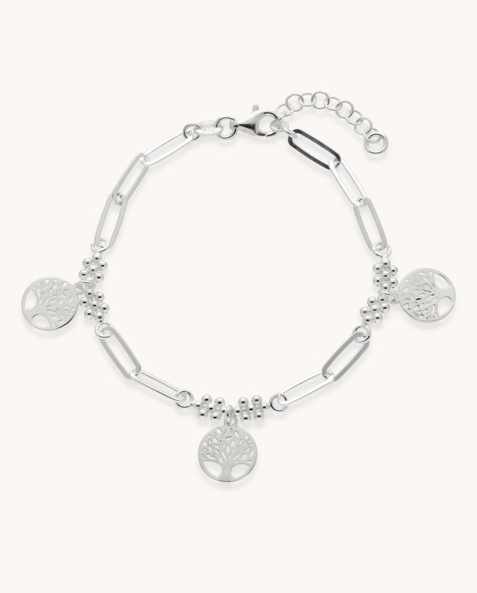 Pulsera de plata de ley 925 con eslabón combinado y tres colgantes de árbol de la vida, largo de 17 cms más 3 cms de alargador y cierre de mosquetón.