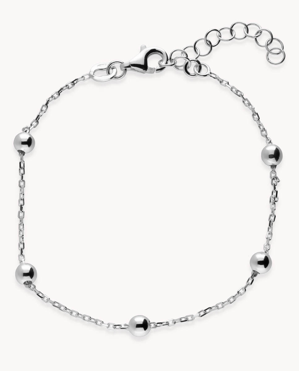 Pulsera de plata de ley 925 bañada en rodio con bolas de 4 mm de diámetro, largo de 16,5 cms más 3,5 cms de alargador y cierre de mosquetón.