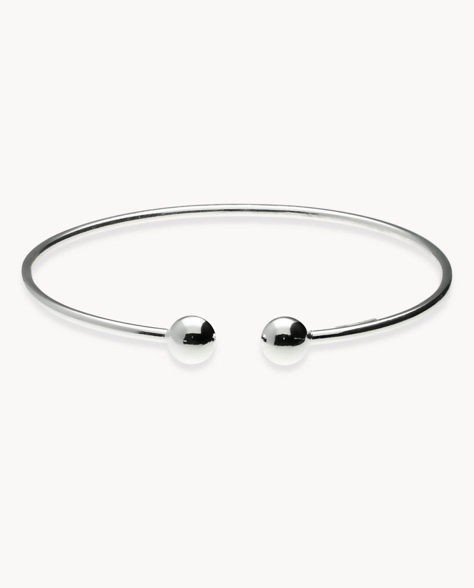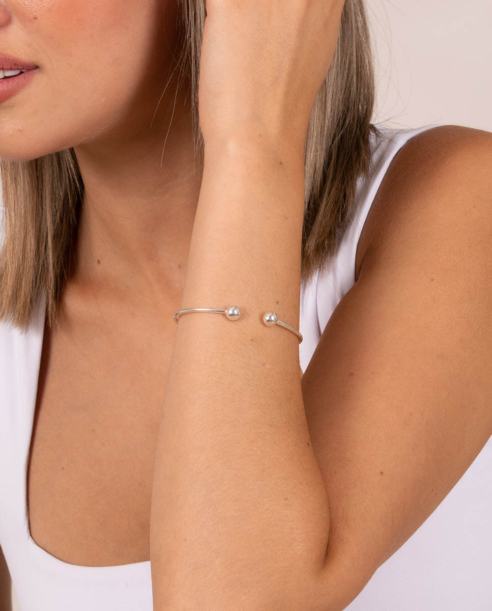 Pulsera de plata de ley 925 estilo media caña de 55 mm de diámetro y dos bolas de 7 mm de diámetro.