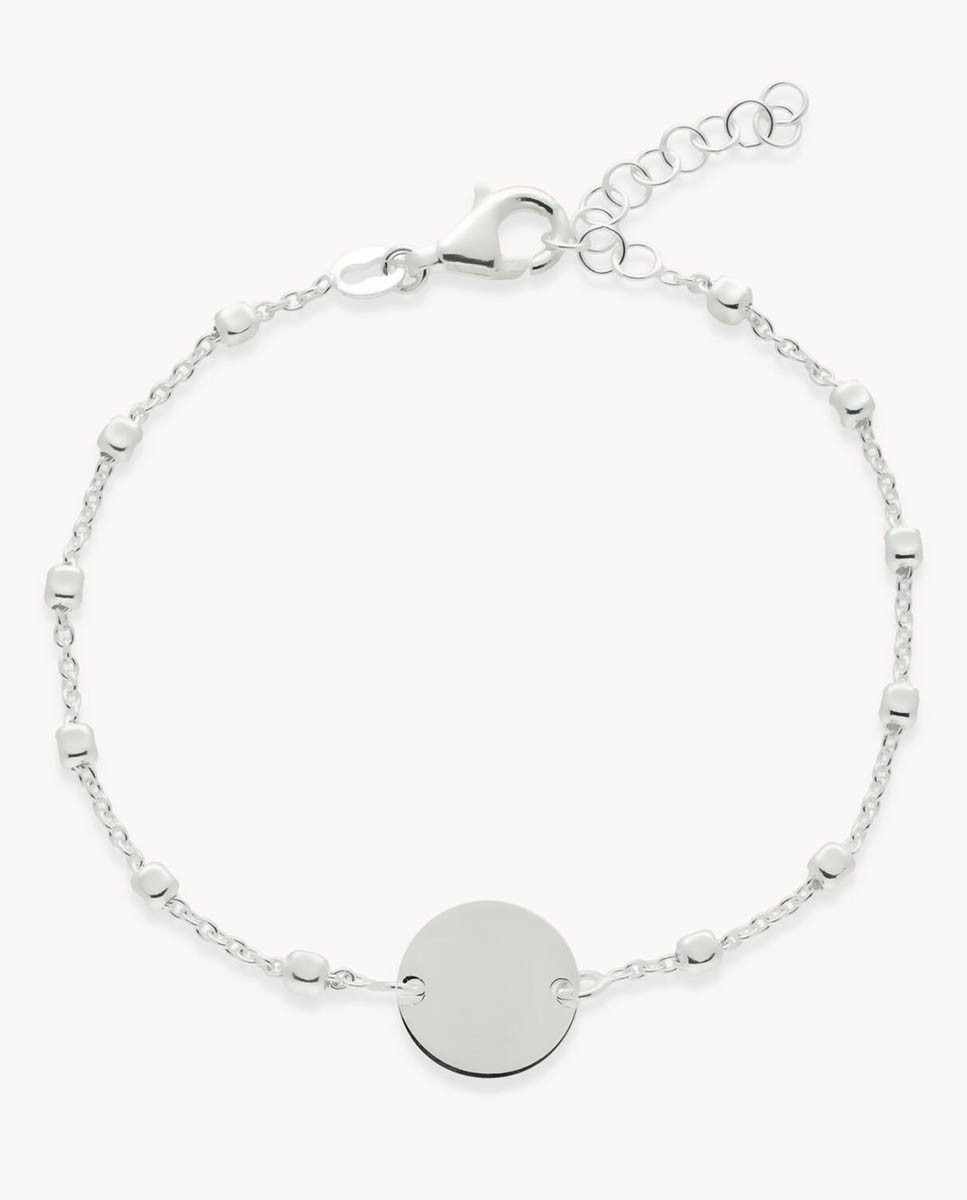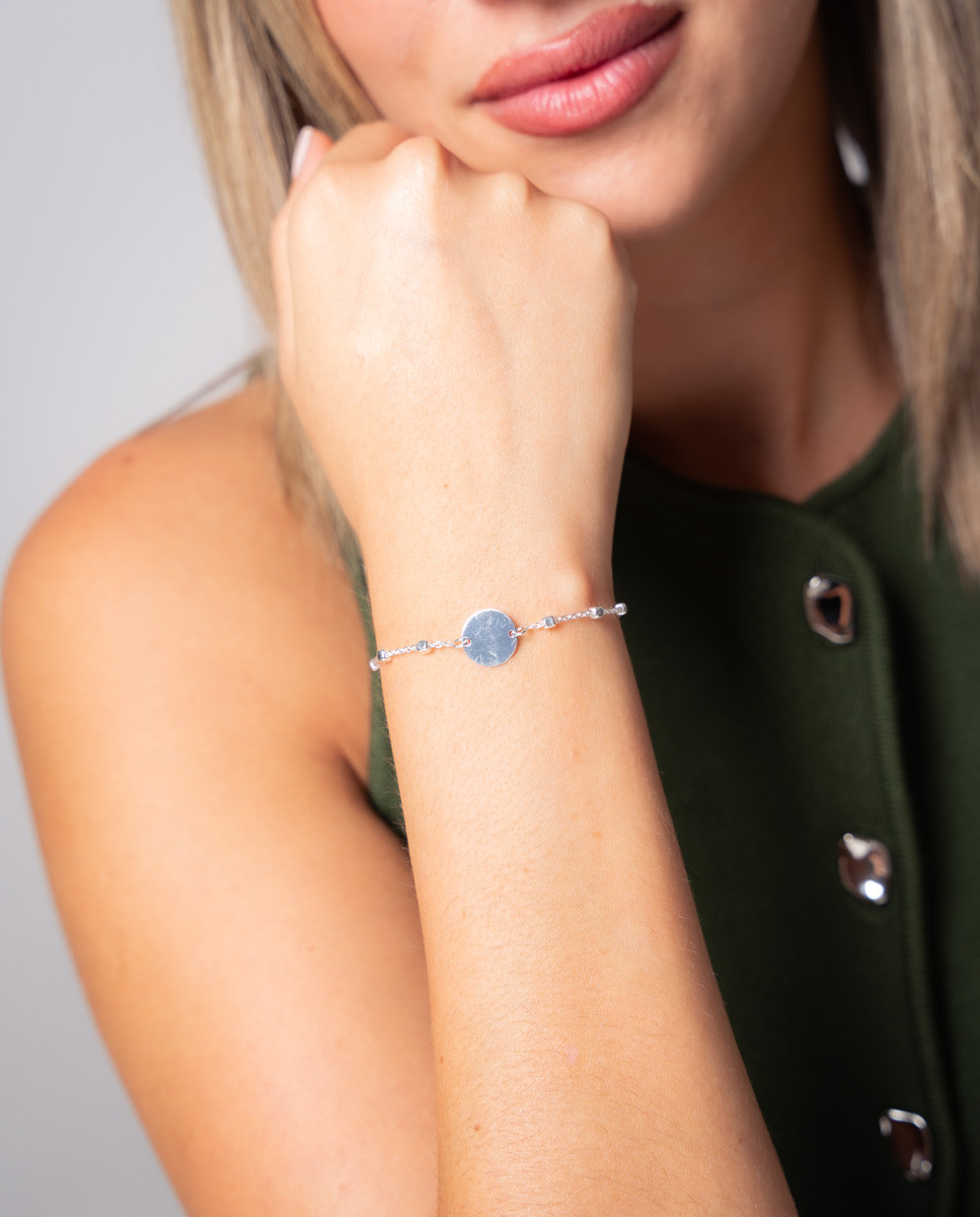 Pulsera de plata de ley 925 con cadena y bolas, detalle de placa central de 11 mm de diámetro, cierre de mosquetón y largo de 17 cms más 3 cms de alargador.