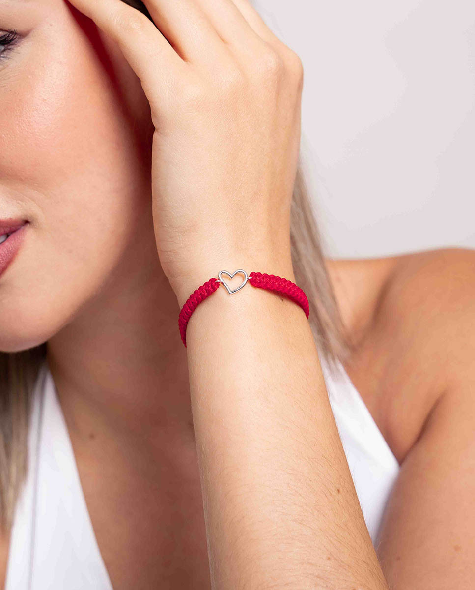 Pulsera corazón macramé rojo de plata de ley 925 bañada en rodio