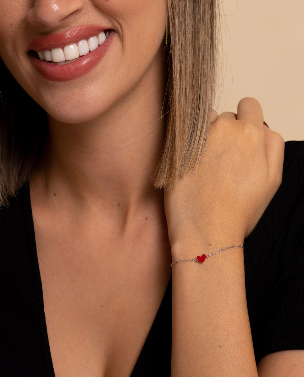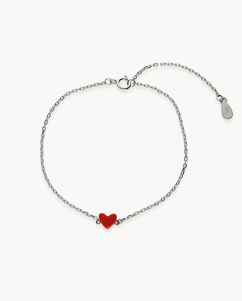 Pulsera de plata de ley 925 bañada en rodio con corazón central rojo de 6 mm x 6 mm (ancho por alto), largo a dos alturas (16 cms y 20 cms) y cierre tipo reasa.