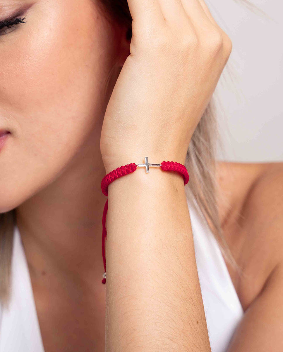 PULSERA OK SILVER CRUZ MACRAMÉ ROJO DE PLATA DE LEY 925 BAÑADA EN RODIO