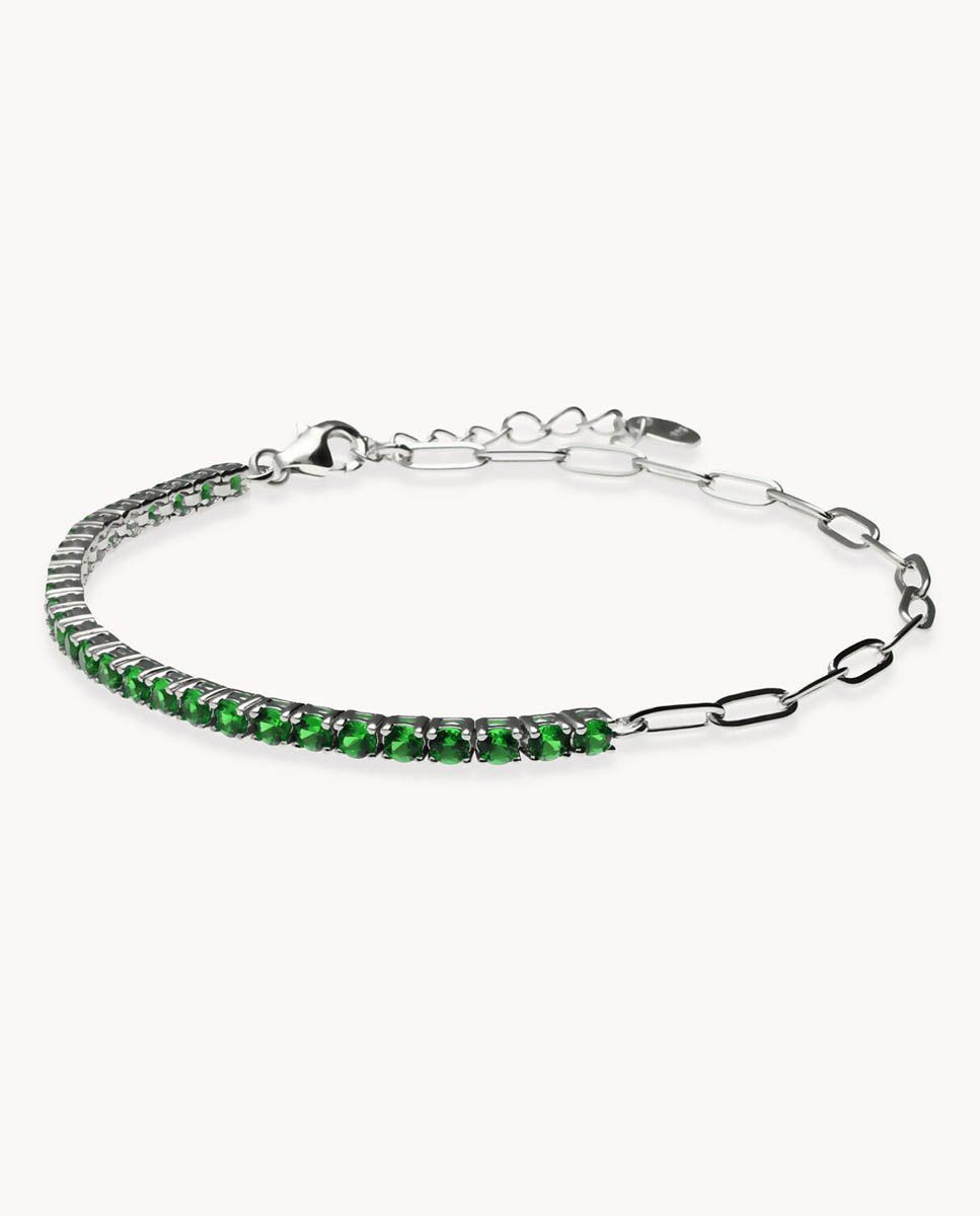 Pulsera de plata de ley 925 bañada en rodio combinada mitad de circonitas color esmeralda de 2,5 mm y mitad de eslabones, largo de 18 cms más 3 cms de alargador y cierre de mosquetón.