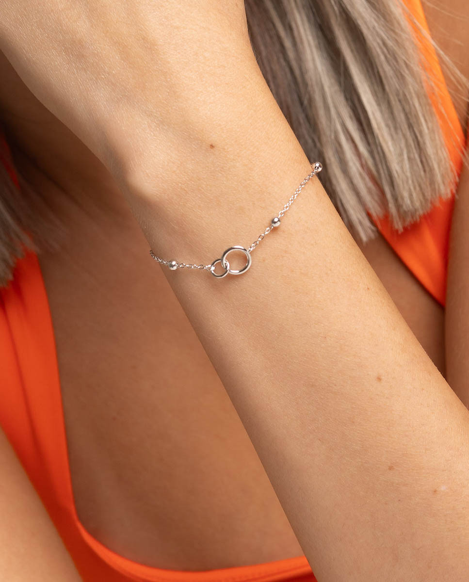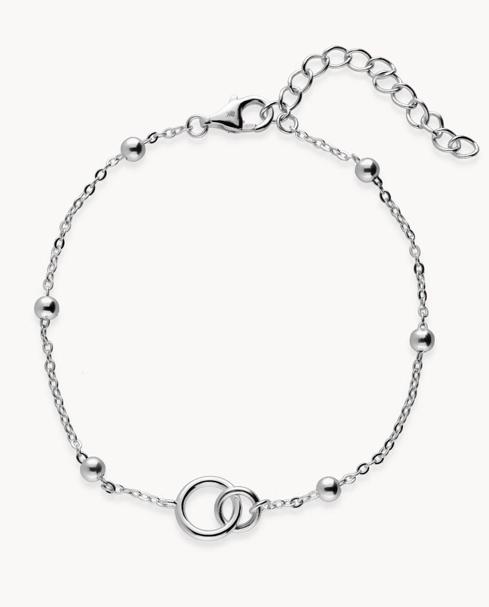 Pulsera de plata de ley 925 bañada en rodio con bolas intercaladas de 3 mm de diámetro y doble karma entrelazado en la parte central, cierre de mosquetón y largo de 17 cms más 3,5 cms de alargador.