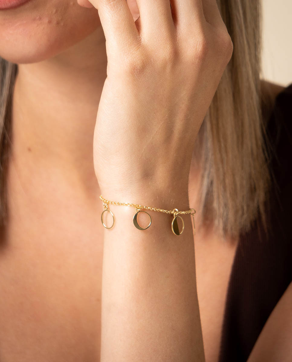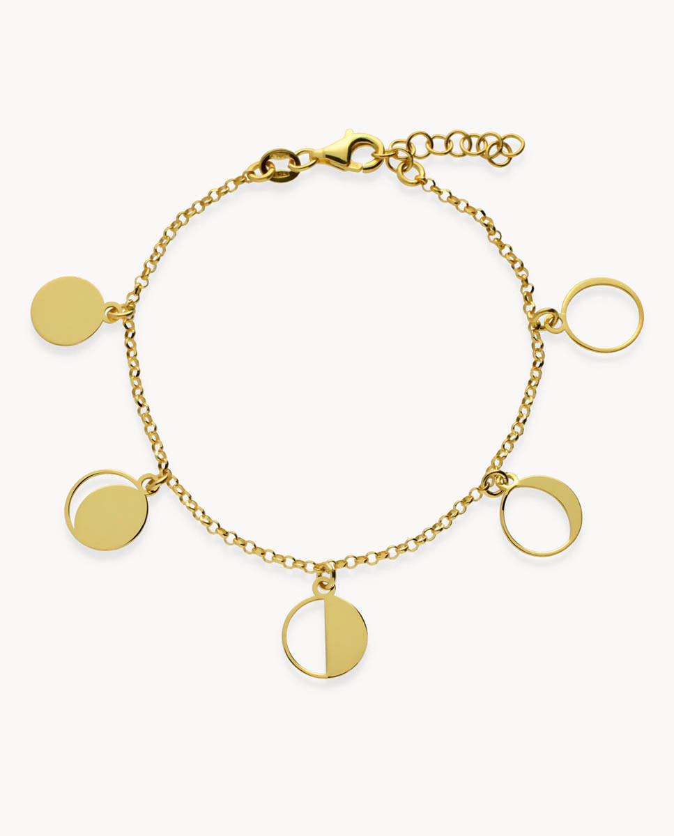 Pulsera de plata de ley 925 bañada en oro 18k con cinco círculos de 9 mm de diámetro representando las fases de la Luna, largo de 17 cms más 3 cms de alargador y cierre de mosquetón.