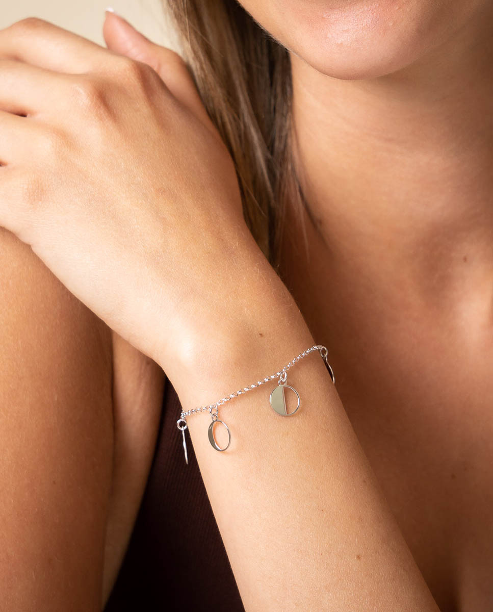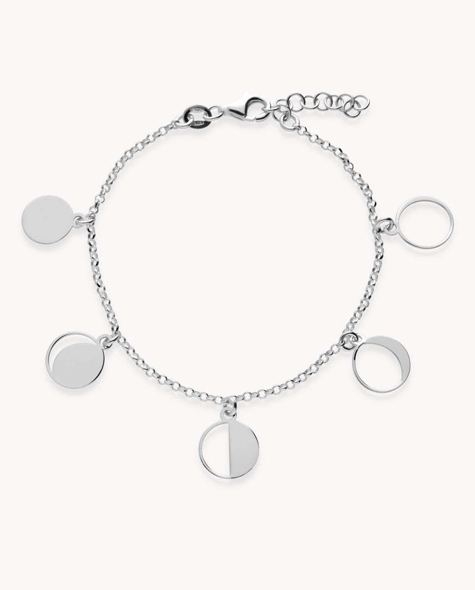 Pulsera de plata de ley 925 bañada en rodio con cinco círculos de 9 mm de diámetro representando las fases de la Luna, largo de 17 cms más 3 cms de alargador y cierre de mosquetón.