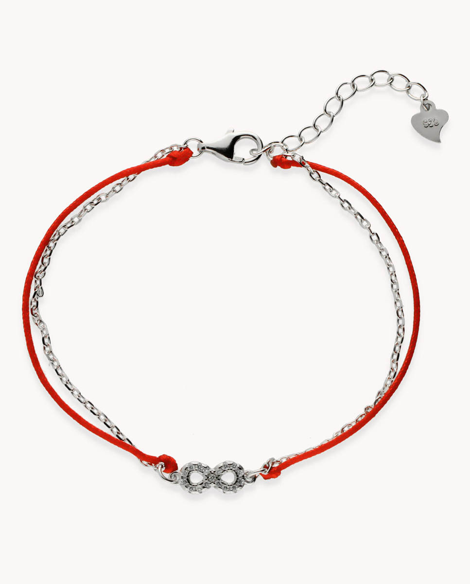 Pulsera de plata de ley 925 bañada en rodio con nylon rojo combinado con cadena de plata, motivo central de infinito de 9 mm x 4 mm (ancho por alto) con circonitas blancas, largo de 17 cms más 3 cms de alargador y cierre de mosquetón.
