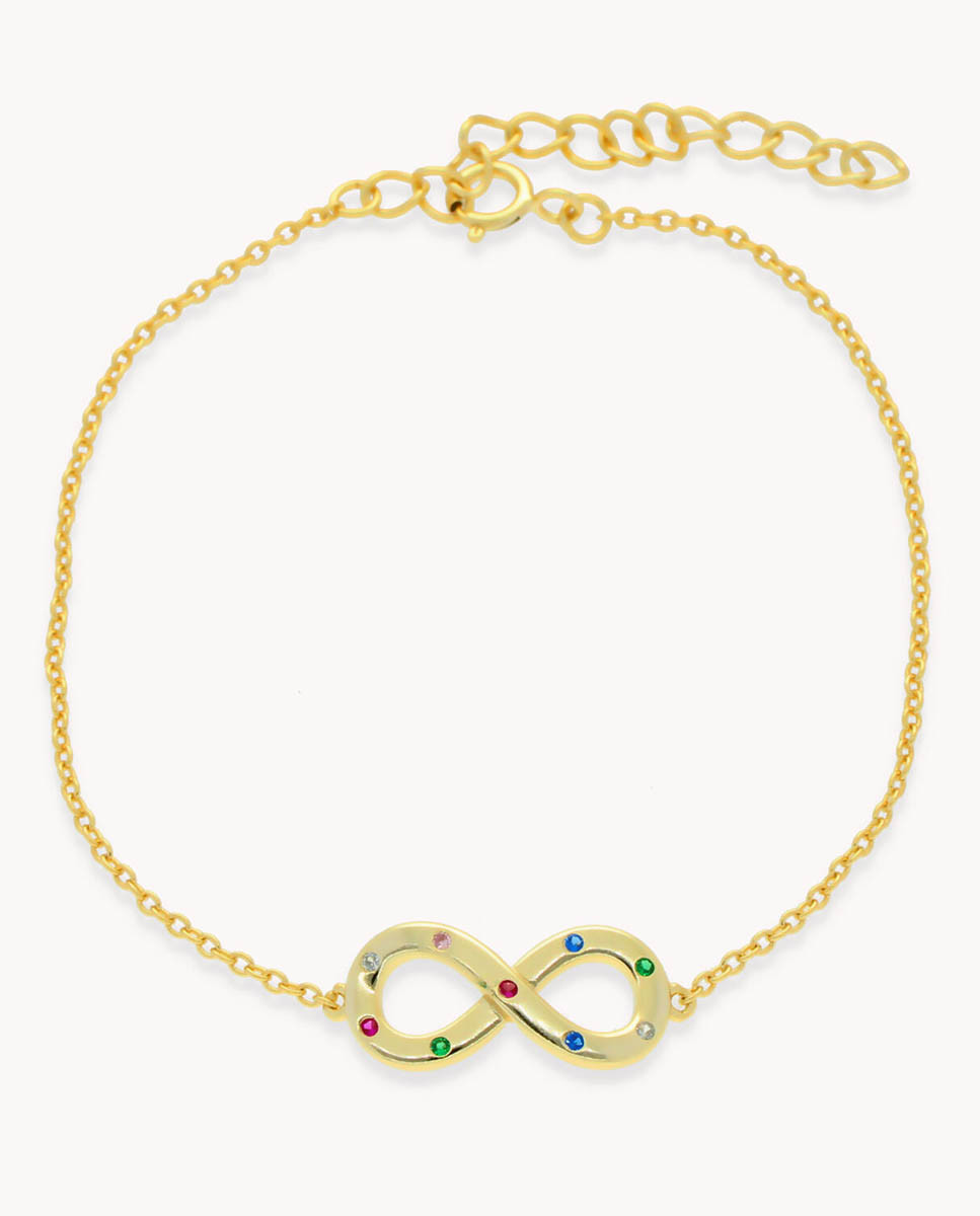 Pulsera de plata de ley 925 bañada en oro con motivo central de infinito de 17 mm x 8 mm (ancho por alto) con circonitas multicolor, cierre tipo reasa y largo de 15,5 cms más 4 cms de alargador.