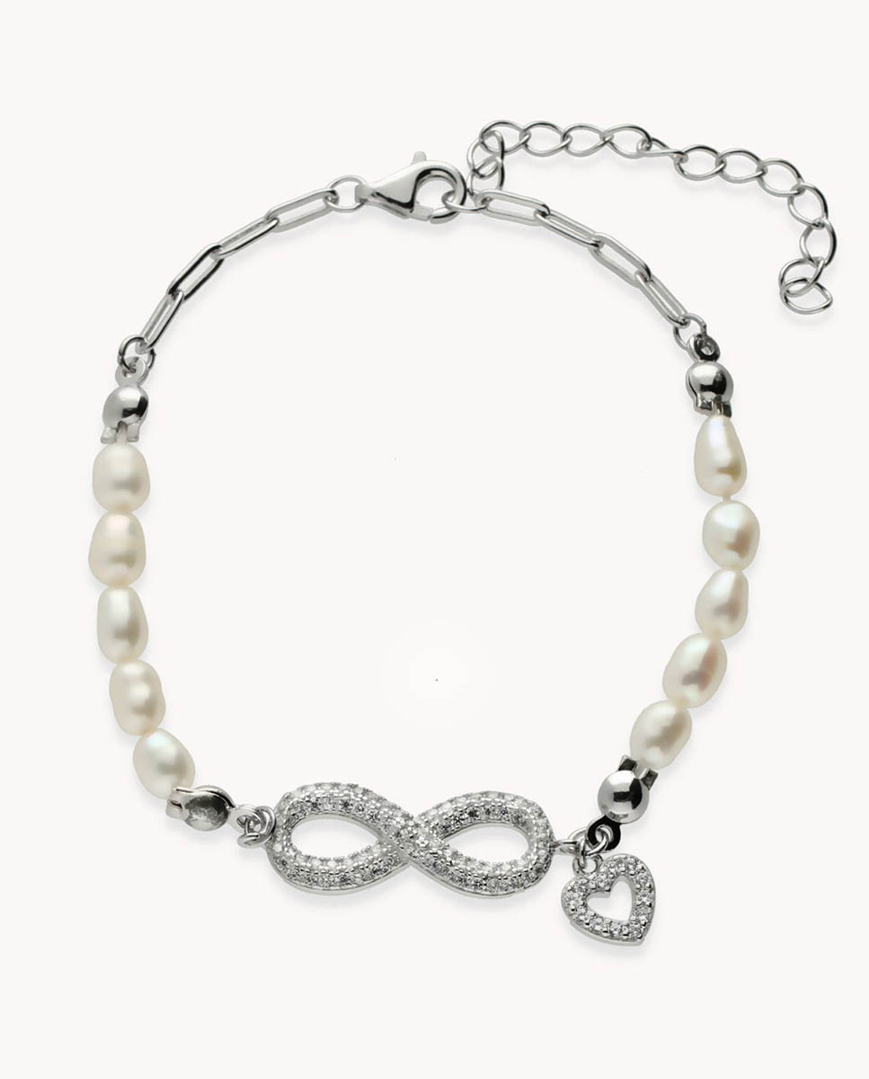 Pulsera de plata de ley 925 bañada en rodio compuesta de perlas cultivadas y eslabones, infinito central con circonitas blancas de 20 mm x 8 mm (ancho por alto) y detalle de corazón colgante de 6 mm x 6 mm (ancho por alto), largo de 16 cms más 4 cms de alargador.