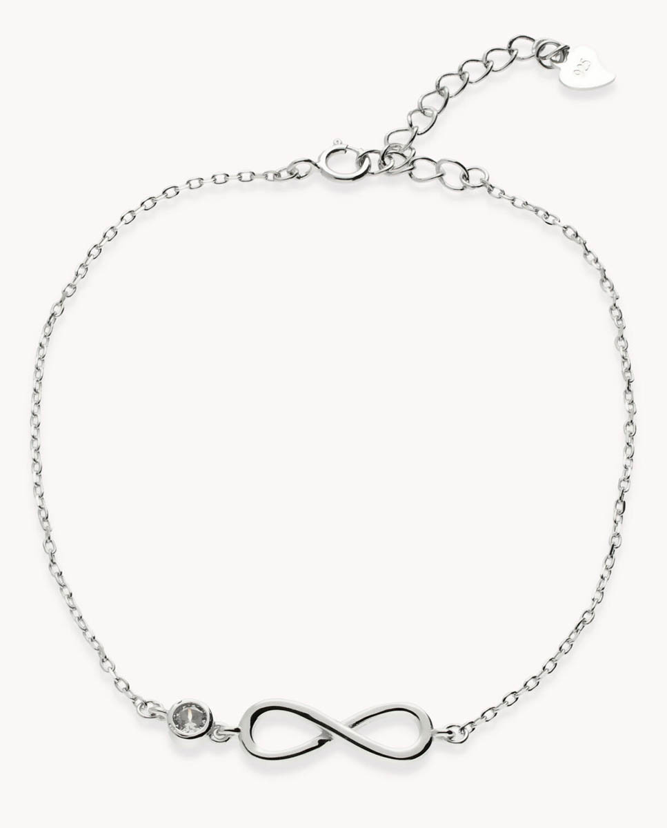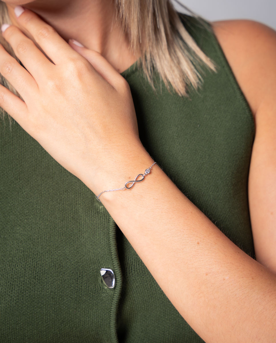 Pulsera de plata de ley 925 bañada en rodio con infinito central de 17 mm x 5 mm (ancho por alto) y una circonitas de 4 mm de diámetro en un lateral, cierre tipo reasa y largo de 18 cms más 3 cms de alargador.