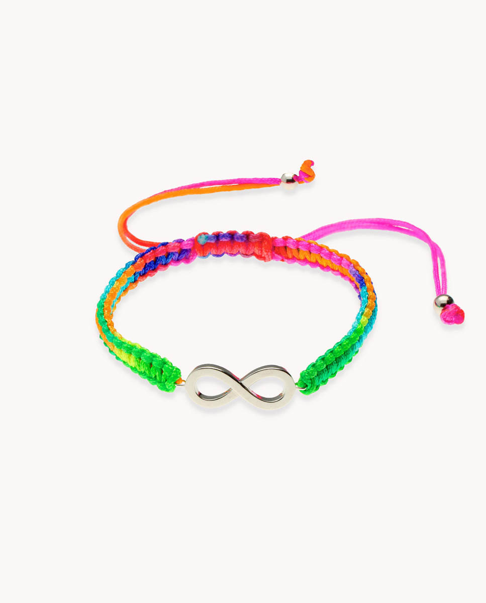 Pulsera de plata de ley 925 bañada en rodio con nylon multicolor y motivo infinito de 19 mm x 8 mm (ancho por alto), ajustable desde 5,5 cms a 10 cms de diámetro.