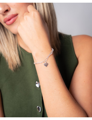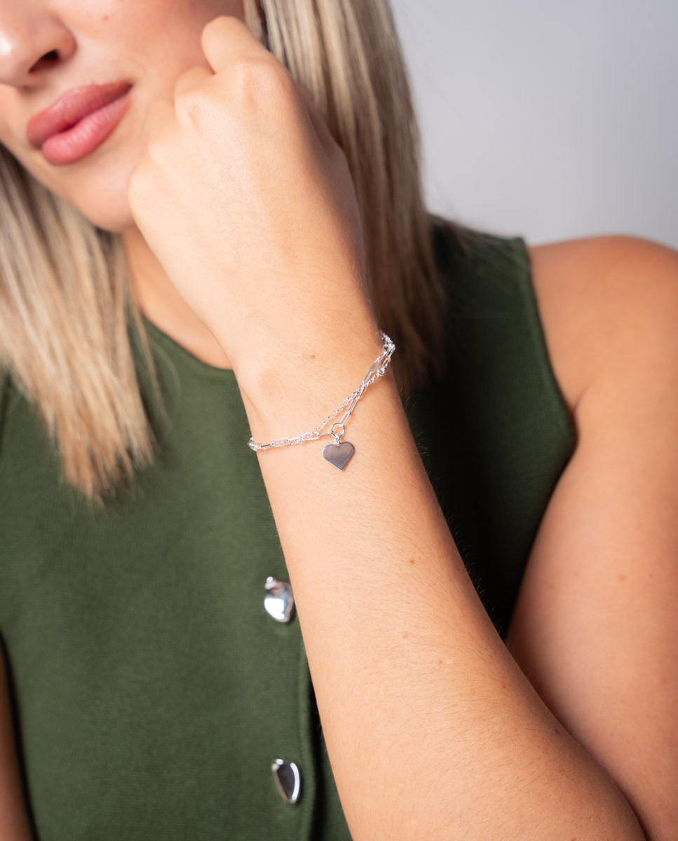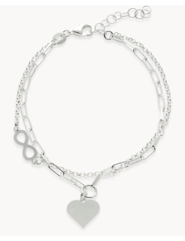 Pulsera de plata de ley 925 con doble cadena, una de ellas con infinito y otra con colgante de corazón, largo de 16,5 cms más 3 cms de alargador y cierre de mosquetón.
