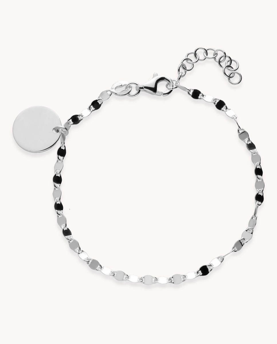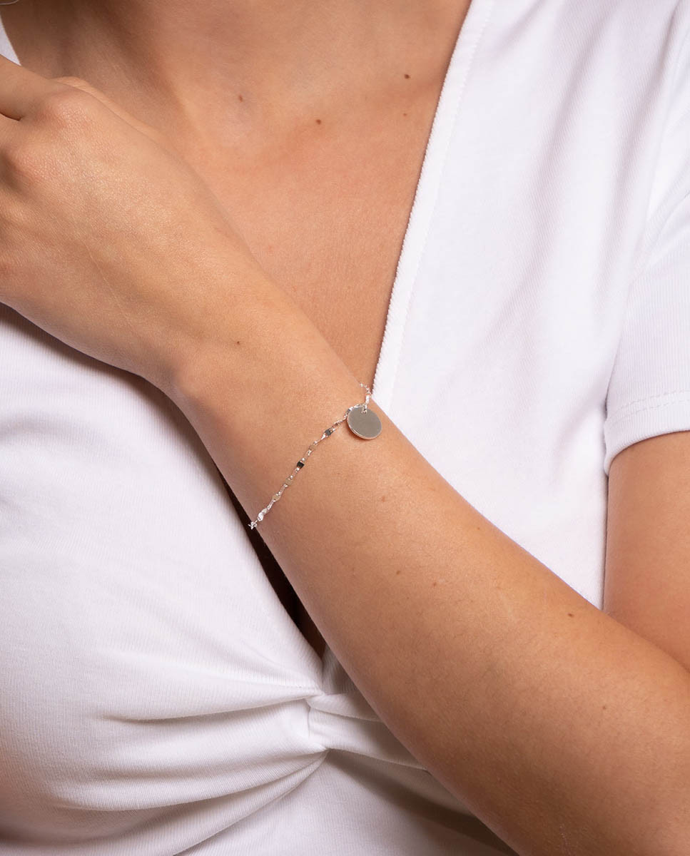 Pulsera de plata de ley 925 con colgante de chapa de 12 mm de diámetro, largo de 16 cms más 3 cms de alargador y cierre de mosquetón.