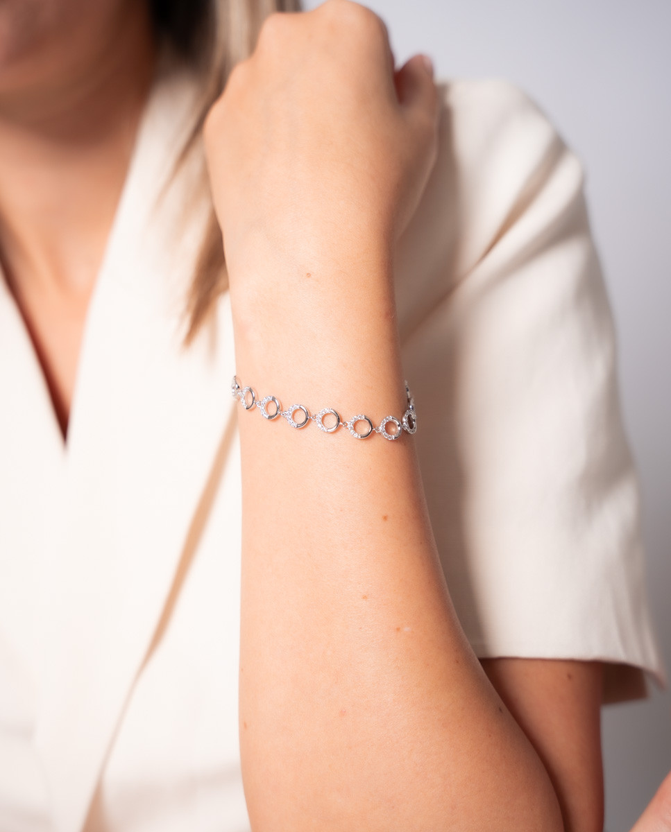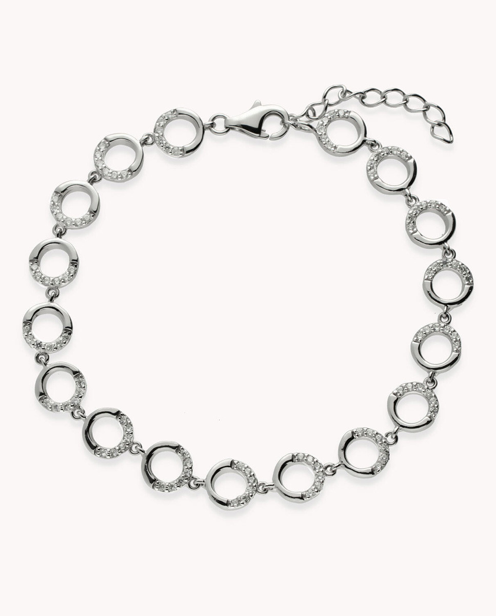 Pulsera de plata de ley 925 bañada en rodio con círculos y circonitas blancas de 7 mm de diámetro, cierre de mosquetón y largo de 18 cms más 3 cms de alargador.