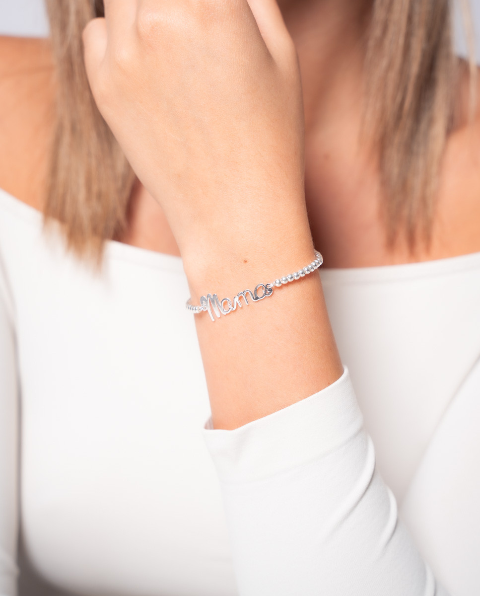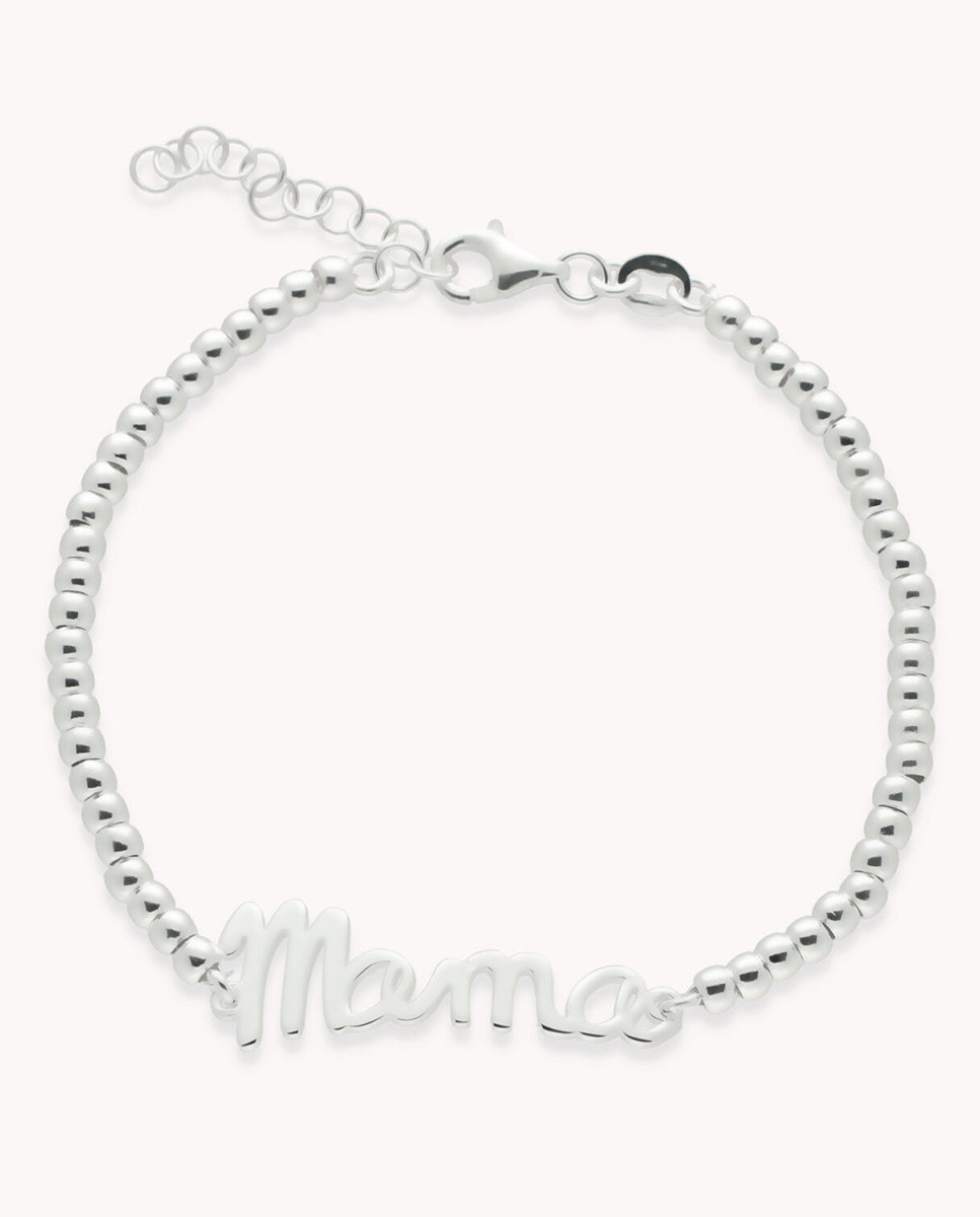 Pulsera de plata de ley 925 con cadena de bolas y motivo central Mamá , largo de 17 cms más 3 cms de alargador y cierre de mosquetón.