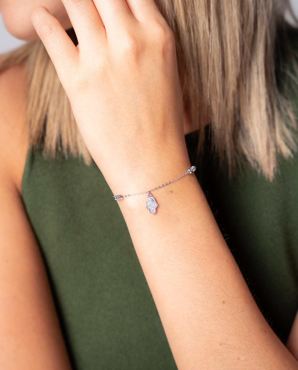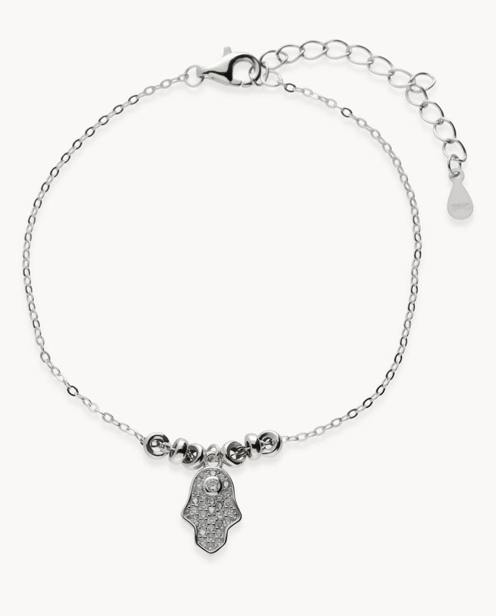 Pulsera de plata de ley 925 bañada en rodio con motivo central de mano de Fátima con circonitas blancas de 7 mm x 11 mm (ancho por alto), cierre de mosquetón y largo de 16 cms más 4 cms de alargador.