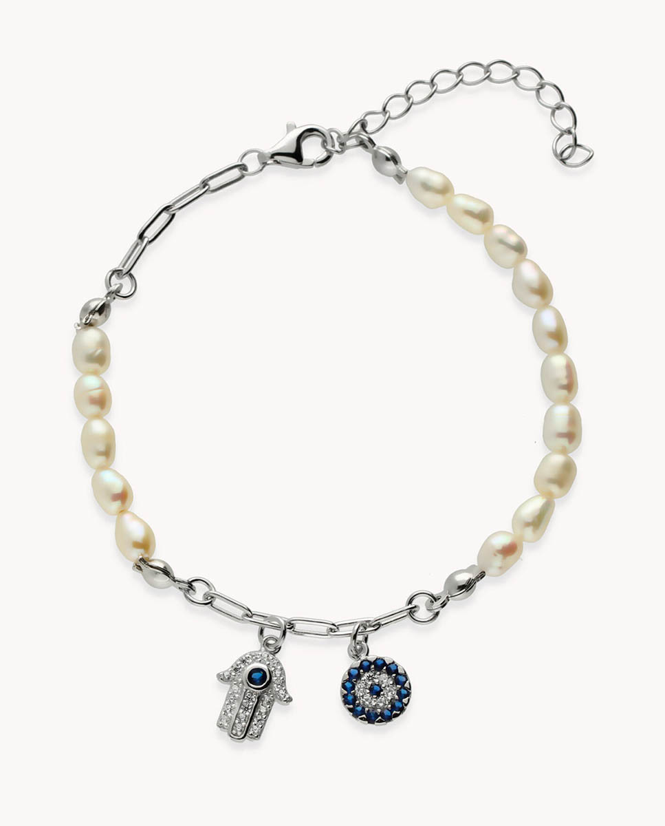 Pulsera mano de fátima con perlas cultivadas de plata de ley 925 bañada en rodio