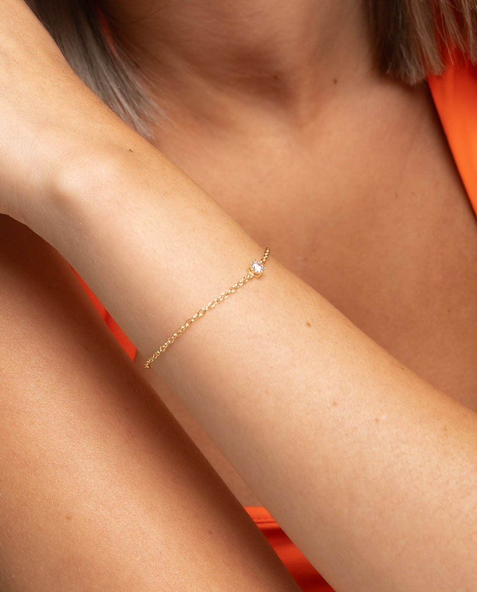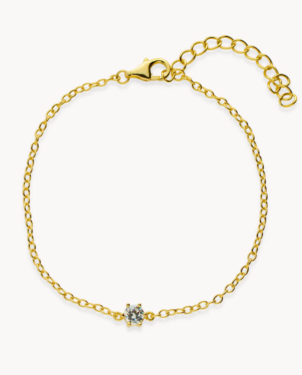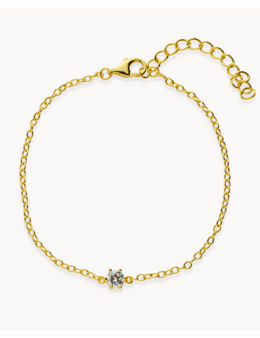 Pulsera de plata de ley 925 bañada en oro 18K con circonita blanca central de 4 mm de diámetro engastada en 6 garras, largo de 16 cms más 4 cms de alargador y cierre de mosquetón.