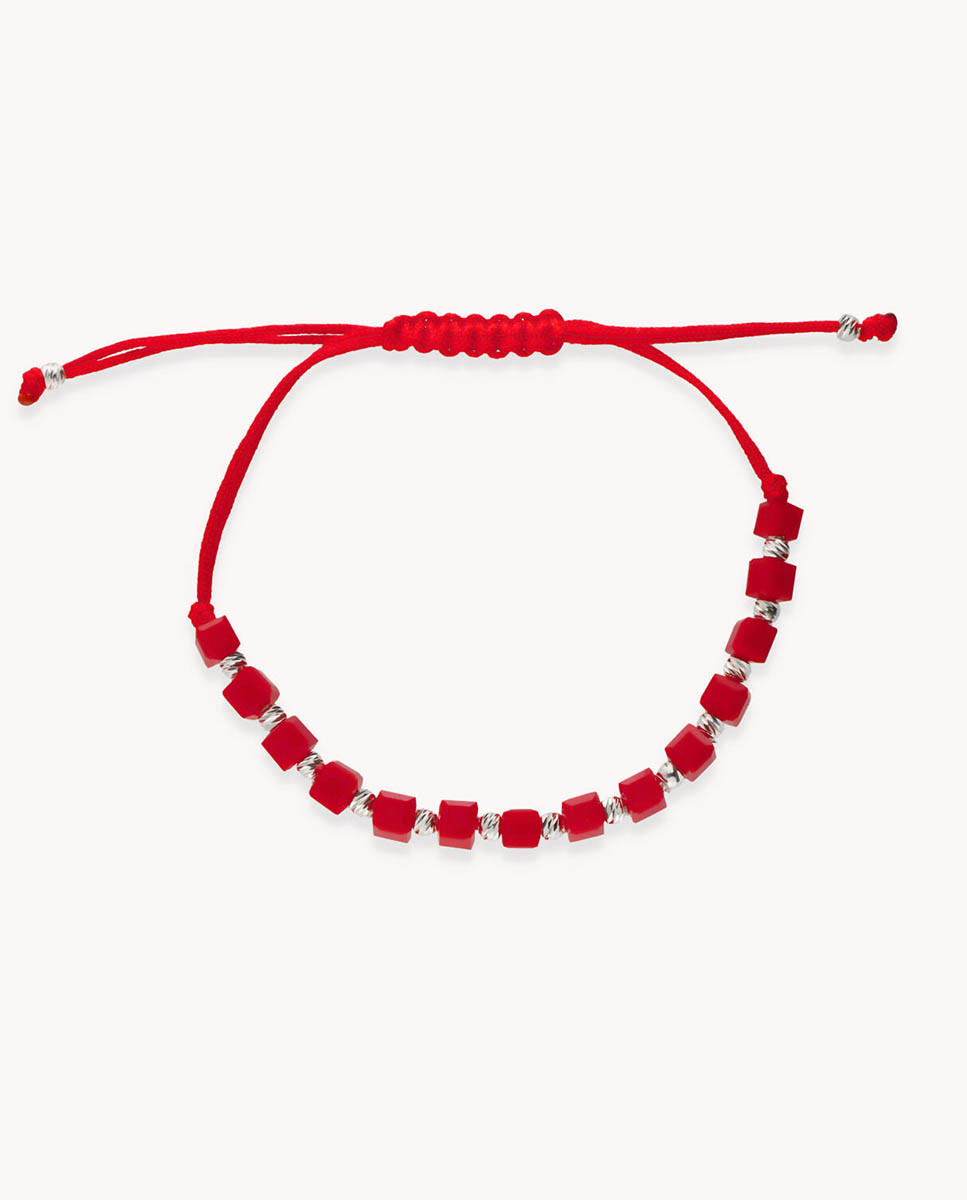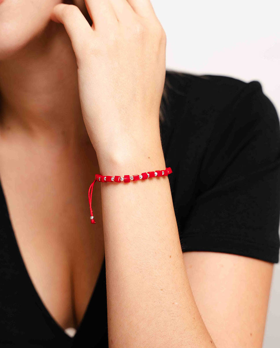 Pulsera de plata de ley 925 bañada en rodio con nylon rojo y entrepiezas de piedra color coral y bolas lapidadas, cierre regulable.