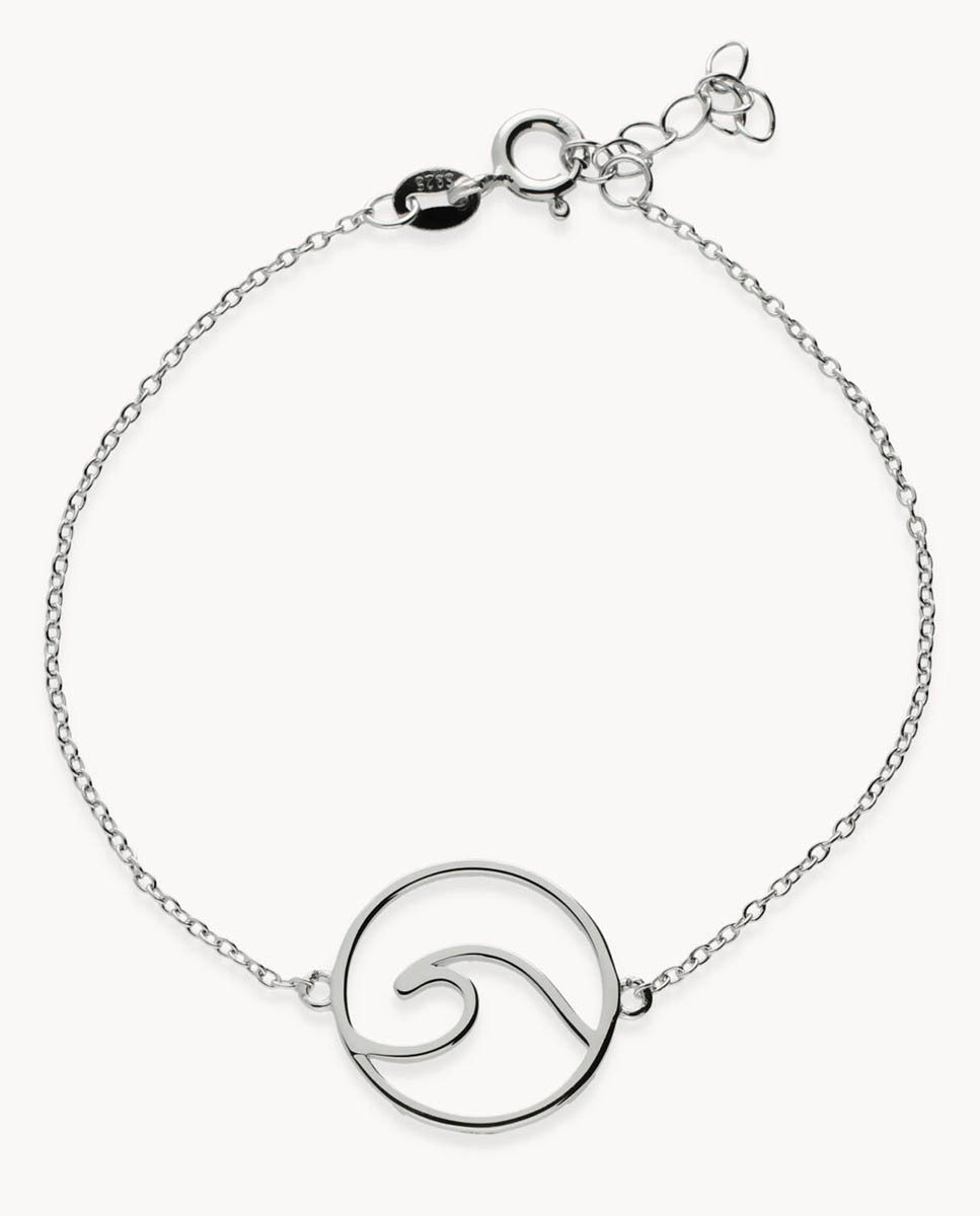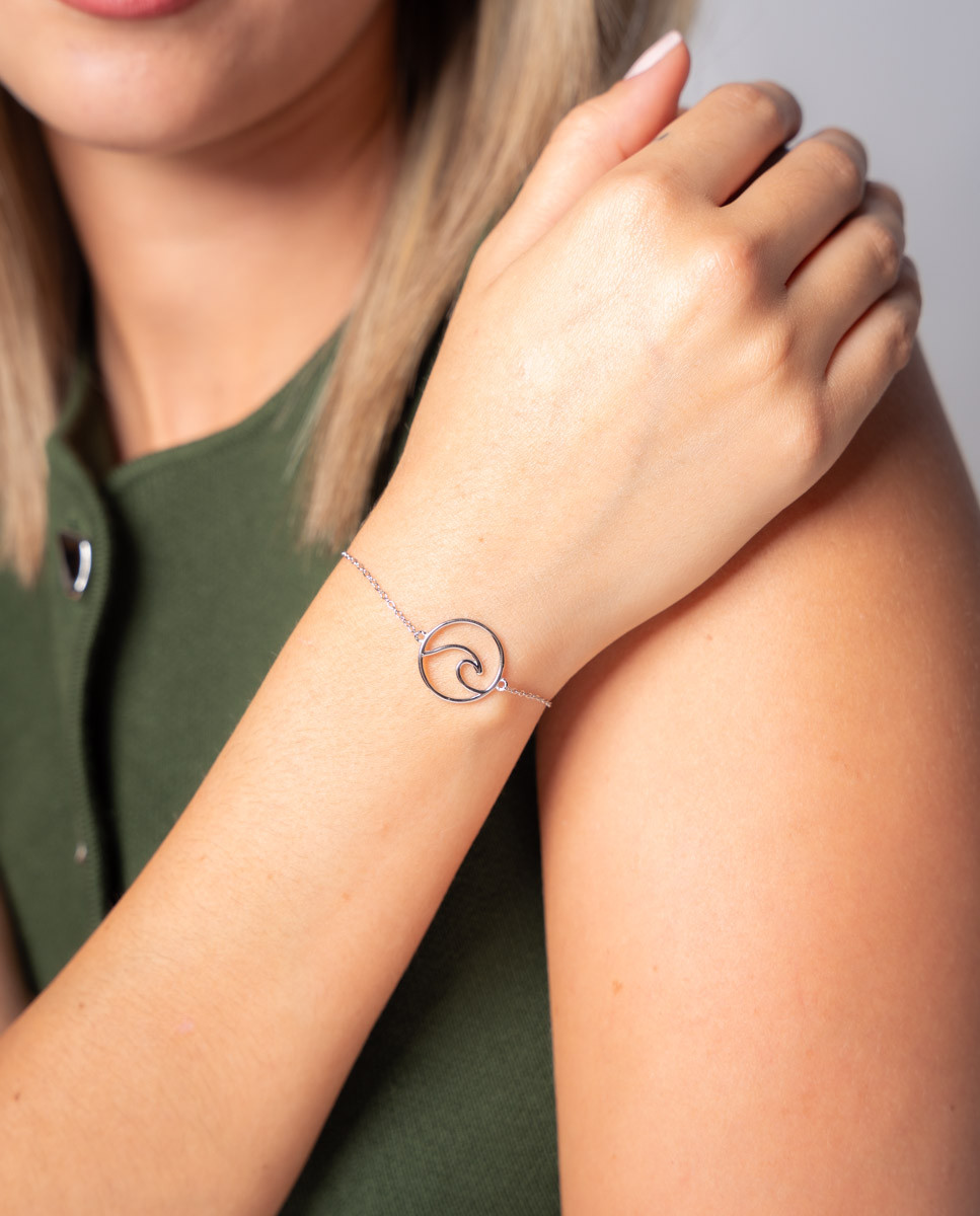 Pulsera de plata de ley 925 bañada en rodio con cadena y detalle central de círculo con ola en su interior de 16 mm de diámetro, cierre tipo reasa y largo de 16,5 cms más 2,5 cms de alargador.