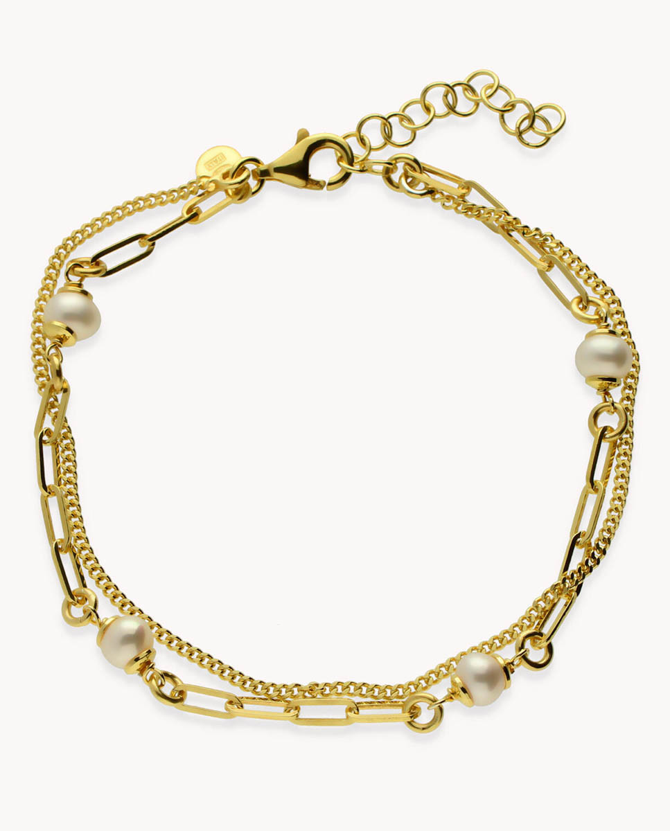 Pulsera doble de plata de ley 925 bañada en oro 18k con perlas cultivadas de 5 mm de diámetro, largo de 16 cms más 3,5 cms de alargador y cierre de mosquetón.