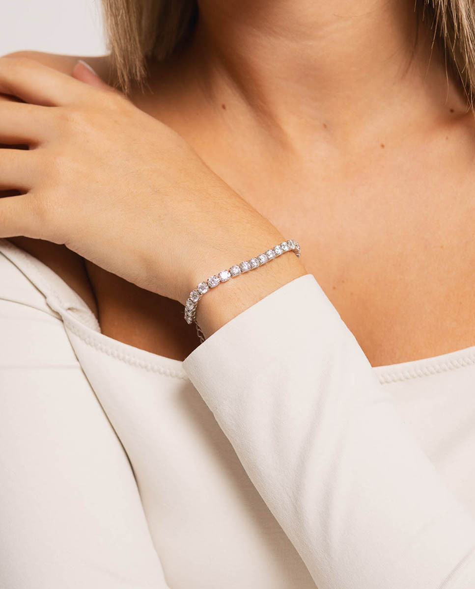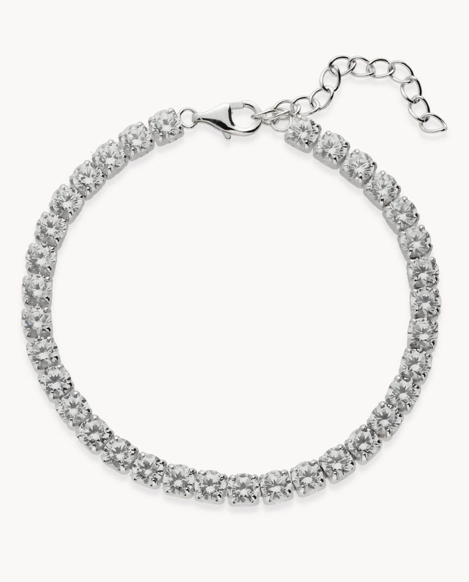 Pulsera de plata de ley 925 bañada en rodio con circonitas blancas de 4 mm de diámetro y largo de 16 cms más 4 cms de alargador, cierre de mosquetón.