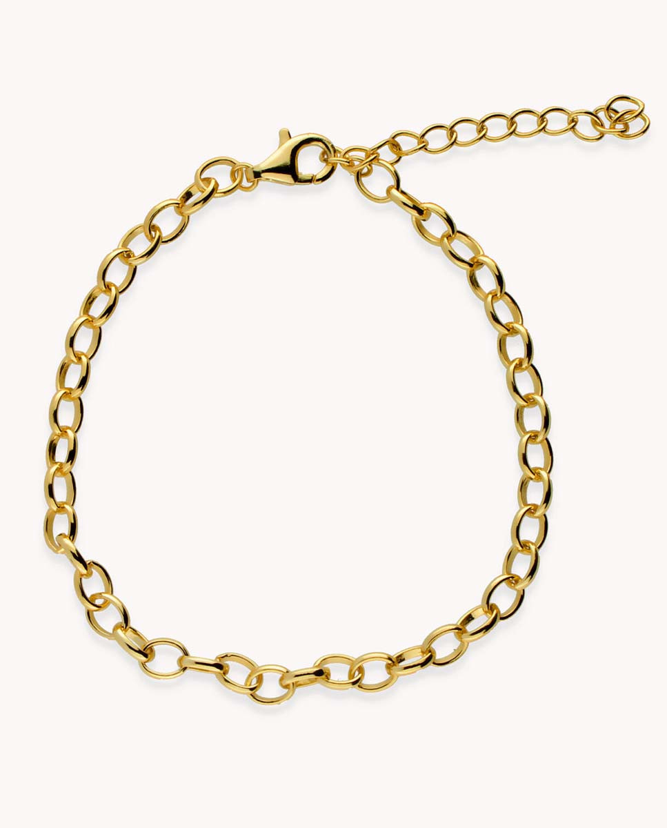 Pulsera de plata de ley 925 bañada en oro con eslabón tipo rolo, largo de 16,5 cms más 4 cms de alargador y cierre de mosquetón.