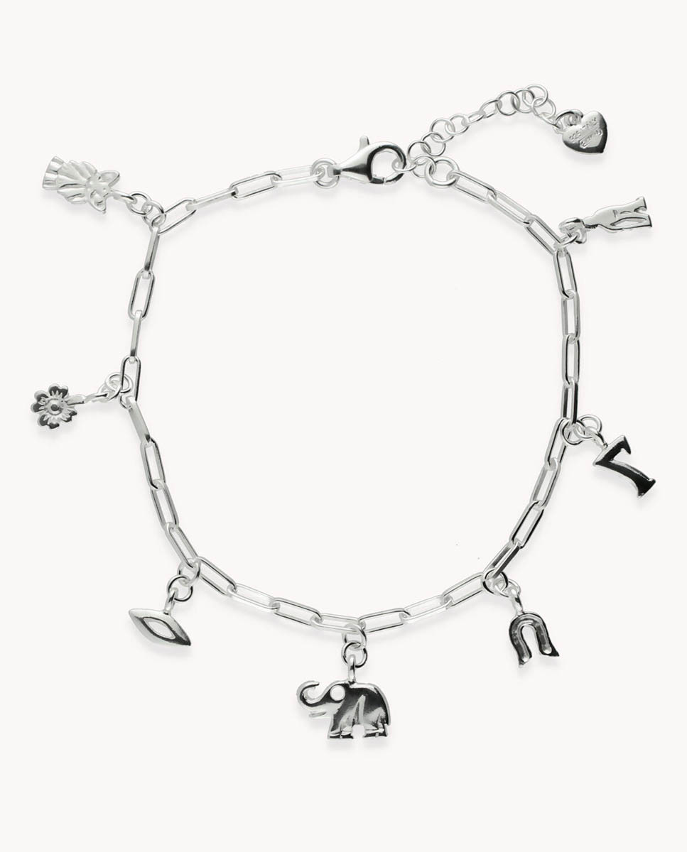 Pulsera de plata de ley 925 con colgantes variados de la suerte, largo de 16,5 cms más 3 cms de alargador con terminal de corazón y cierre de mosquetón.