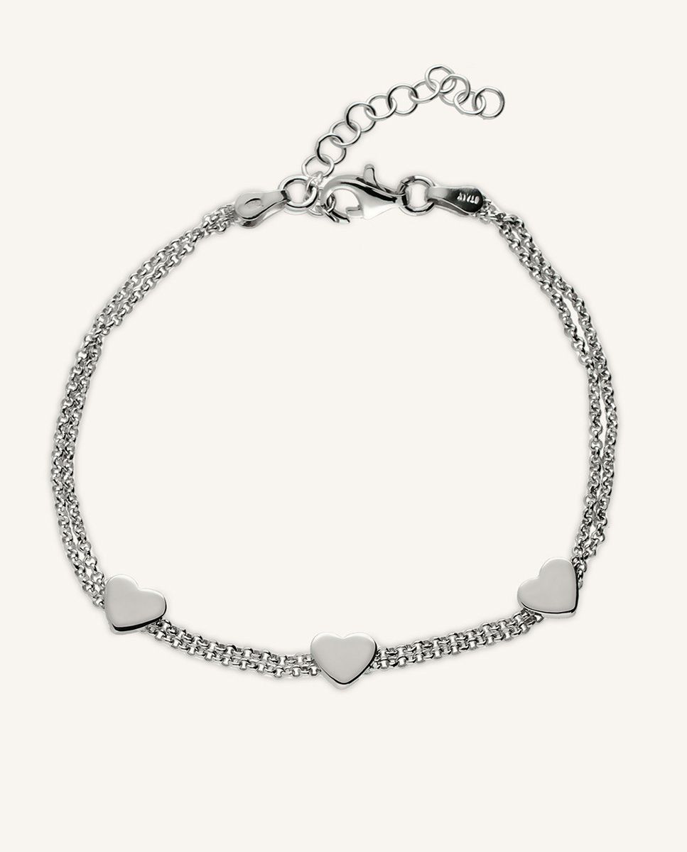 Pulsera de plata de ley 925 bañada en rodio con cadena doble y motivos de corazones, cierre de mosquetón y largo de 17 cms más 3 cms de alargador.