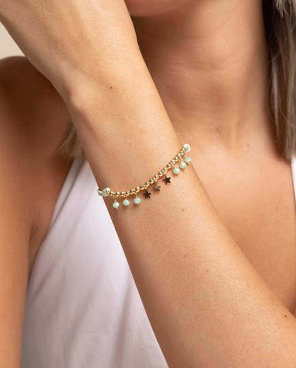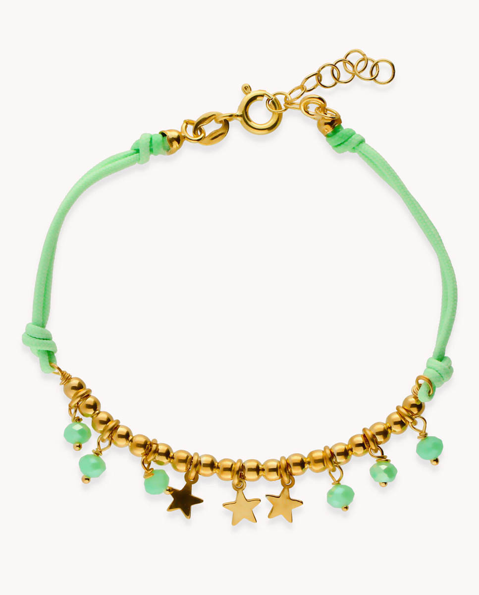 Pulsera de plata de ley 925 bañada en oro 18K con nylon en color verde pastel, colgantes de estrellas de 5 mm x 5 mm (ancho por alto) y piedras turquesas de 4 mm de diámetro, bolas en la parte central de 2 mm de diámetro y largo de 16 cms más 3 cms de alargador, cierre tipo reasa.