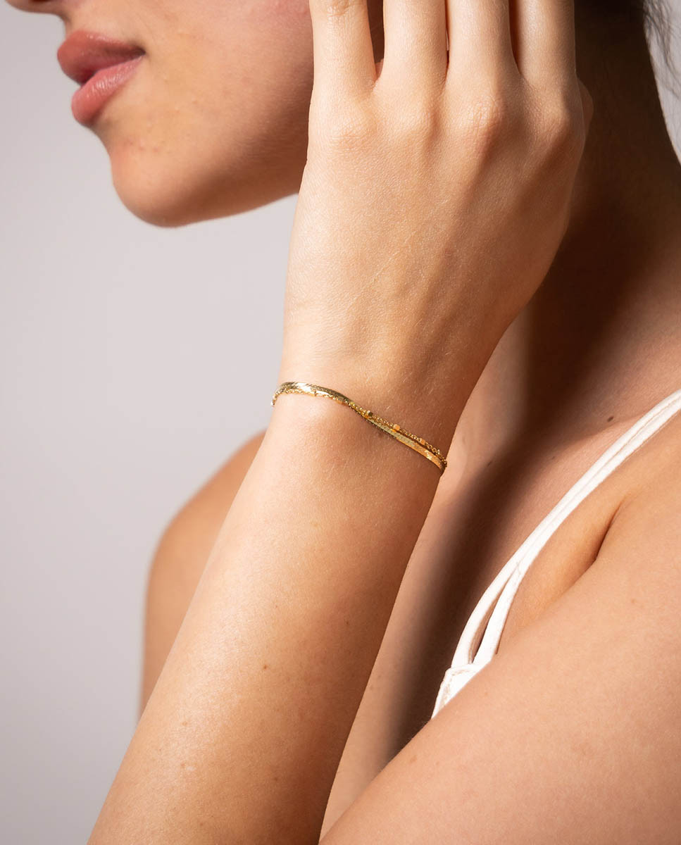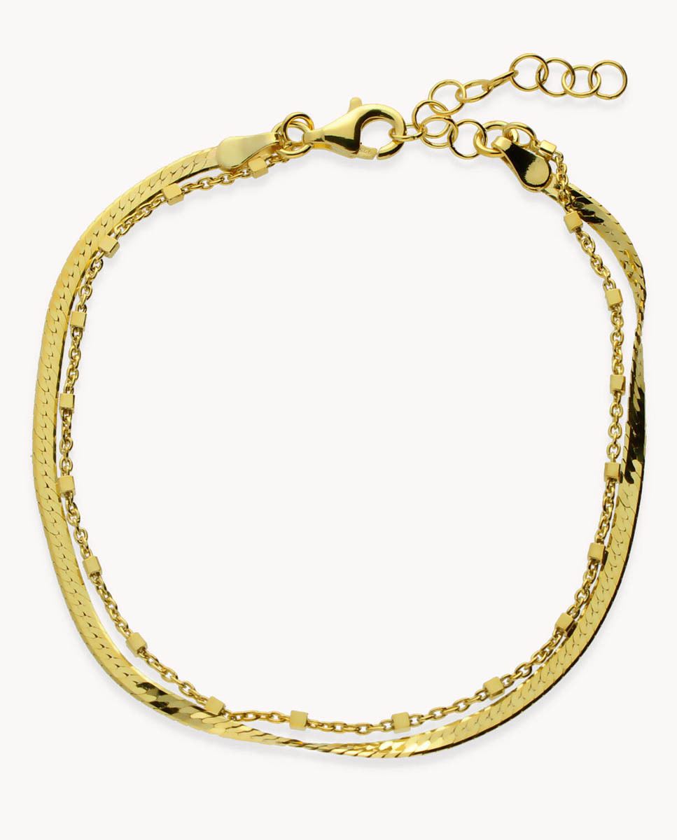 Pulsera doble de plata de ley 925 bañada en oro 18k con cadena tipo serpiente de 2 mm de ancho y cadena con entrepiezas de cuadraditos, largo de 16,5 cms más 3 cms de alargador y cierrre de mosquetón.