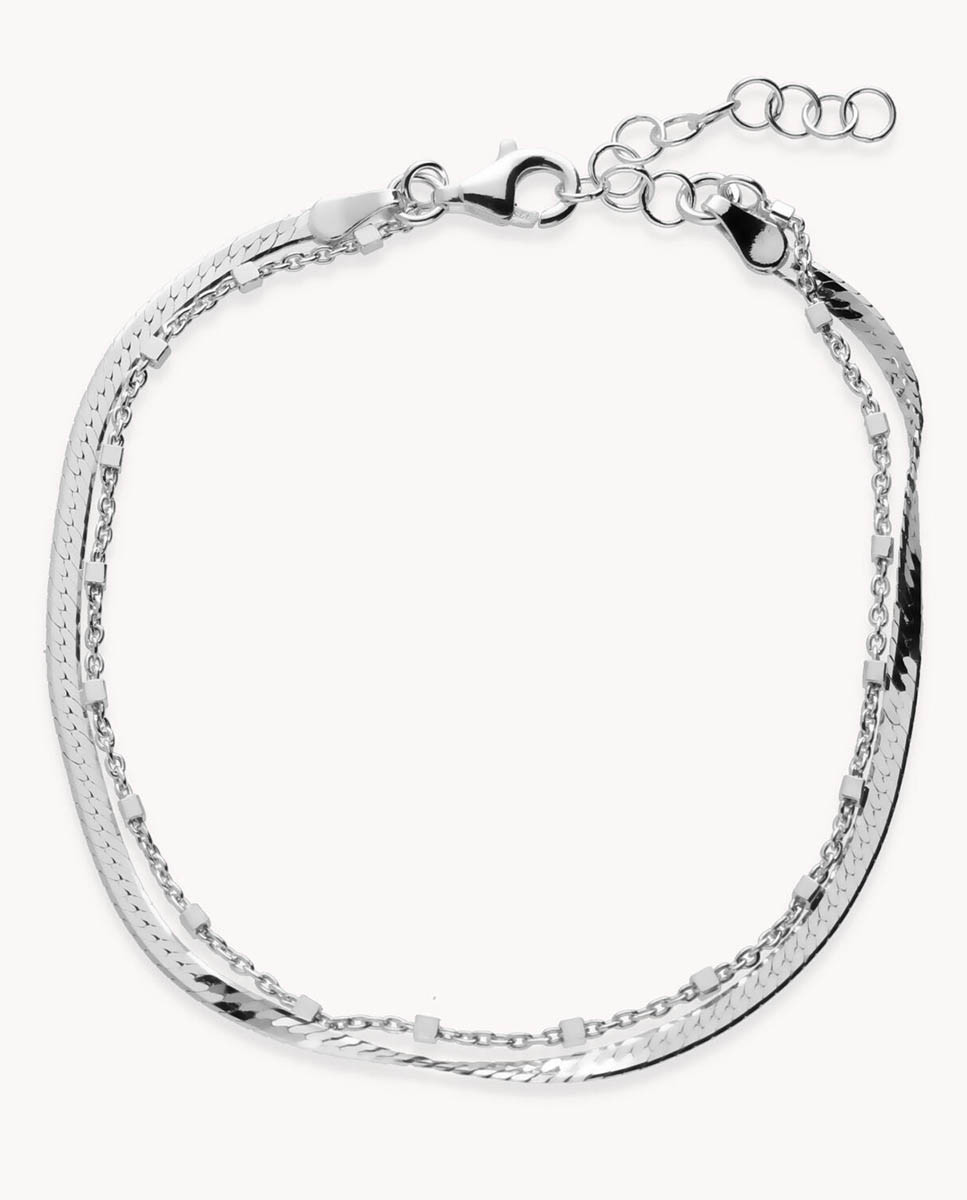 Pulsera doble de plata de ley 925 bañada en rodio con cadena tipo serpiente de 2 mm de ancho y cadena con entrepiezas de cuadraditos, largo de 16,5 cms más 3 cms de alargador y cierrre de mosquetón.