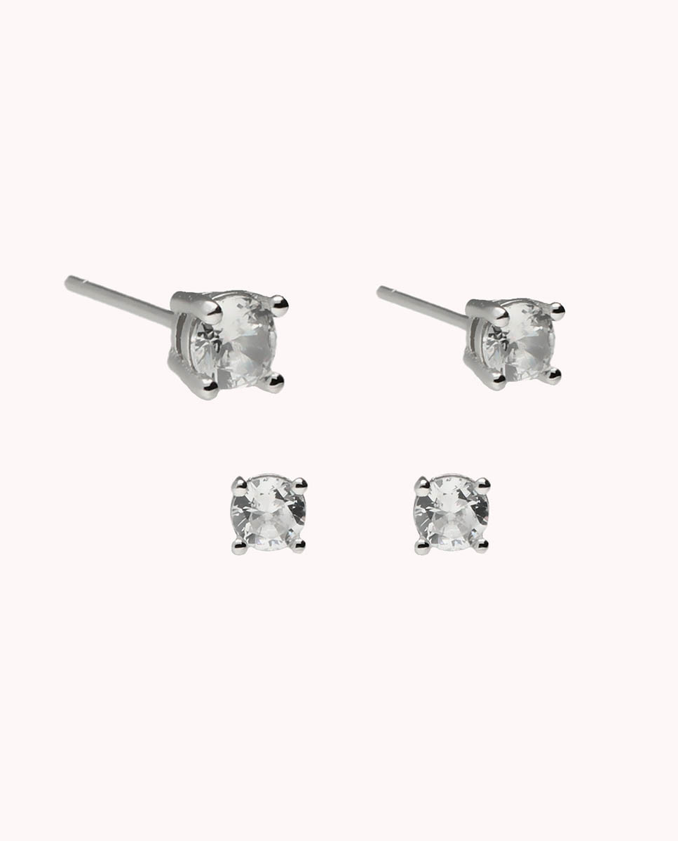 Set de cuatro pendientes individuales de plata de ley 925 bañada en rodio con circonitas blancas engastadas en cuatro garras y diferentes tamaños (2 mm, 3 mm y 4 mm), cierre de presión.
