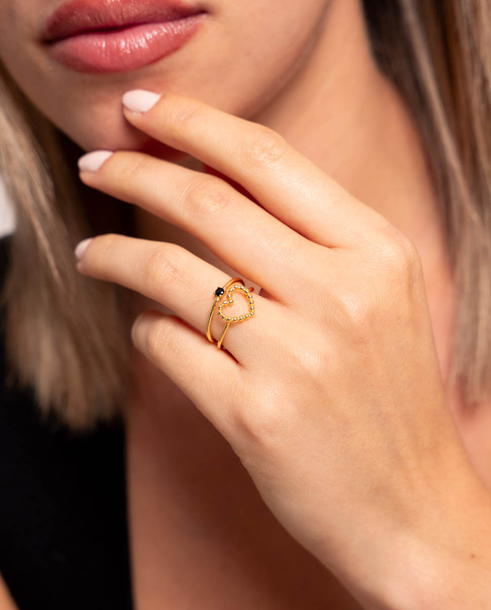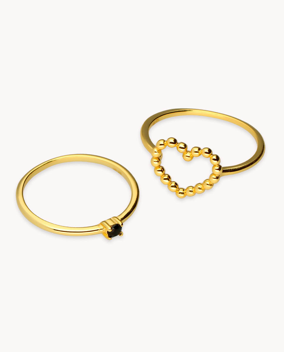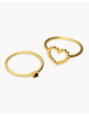Anillo doble de plata de ley 925 bañada en oro 18K compuesto por dos anillos independientes: solitario con circonita negra de 2 mm de diámetro y anillo con silueta de corazón de 10 mm x 10 mm (ancho por alto).