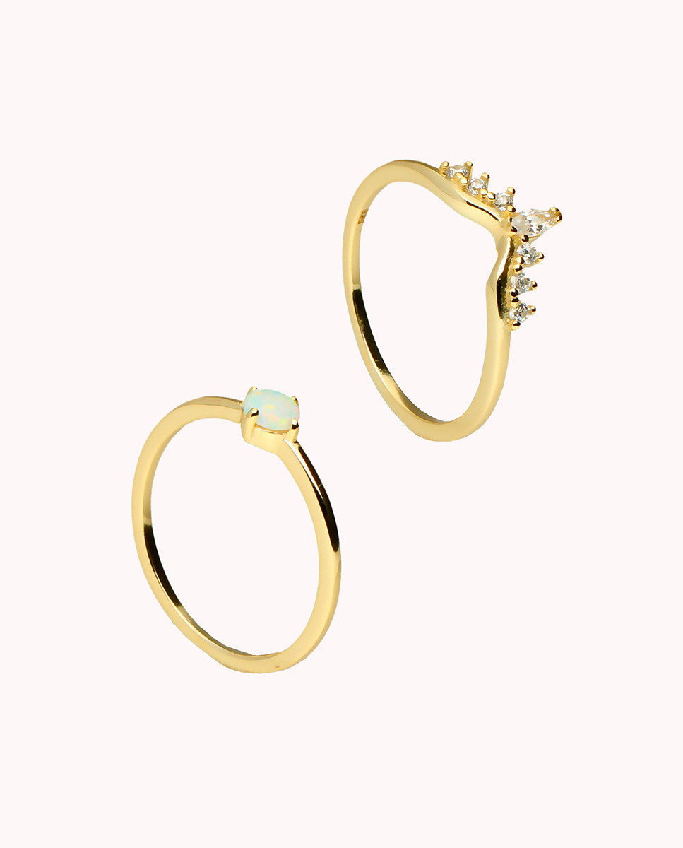 Set de dos anillos corona y opal de plata de ley 925 bañada en oro