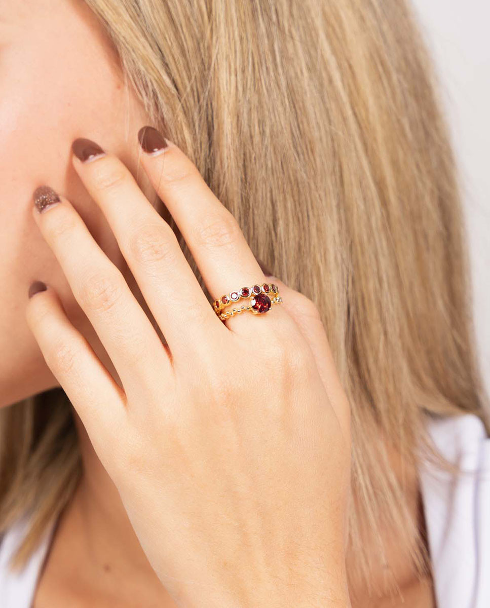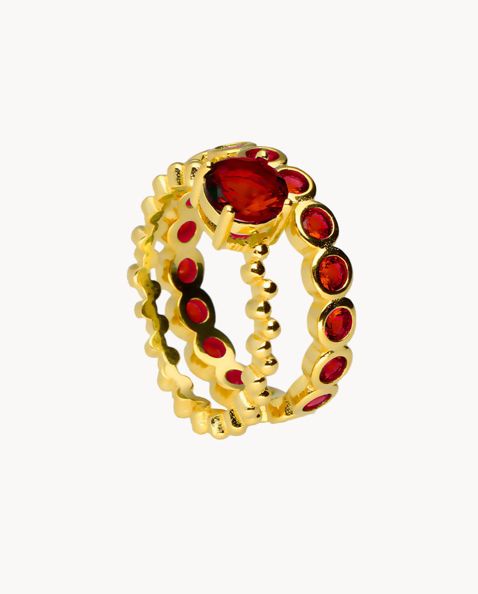 Anillo de plata de ley 925 bañada en oro 18K compuesto por dos anillos independientes, uno tipo alianza completa con circonitas en chatón de 2 mm de diámetro color rubí y otro tipo solitario con circonita central engastada en cuatro garras color rubí de 6 mm de diámetro.