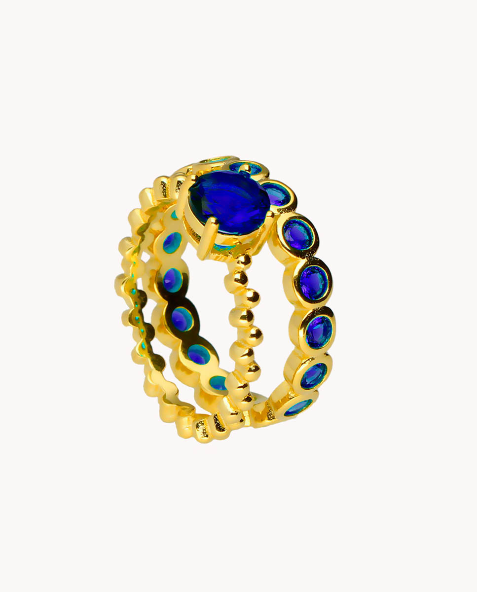 Anillo de plata de ley 925 bañada en oro 18K compuesto por dos anillos independientes, uno tipo alianza completa con circonitas en chatón de 2 mm de diámetro color zafíro y otro tipo solitario con circonita central engastada en cuatro garras color zafíro de 6 mm de diámetro.