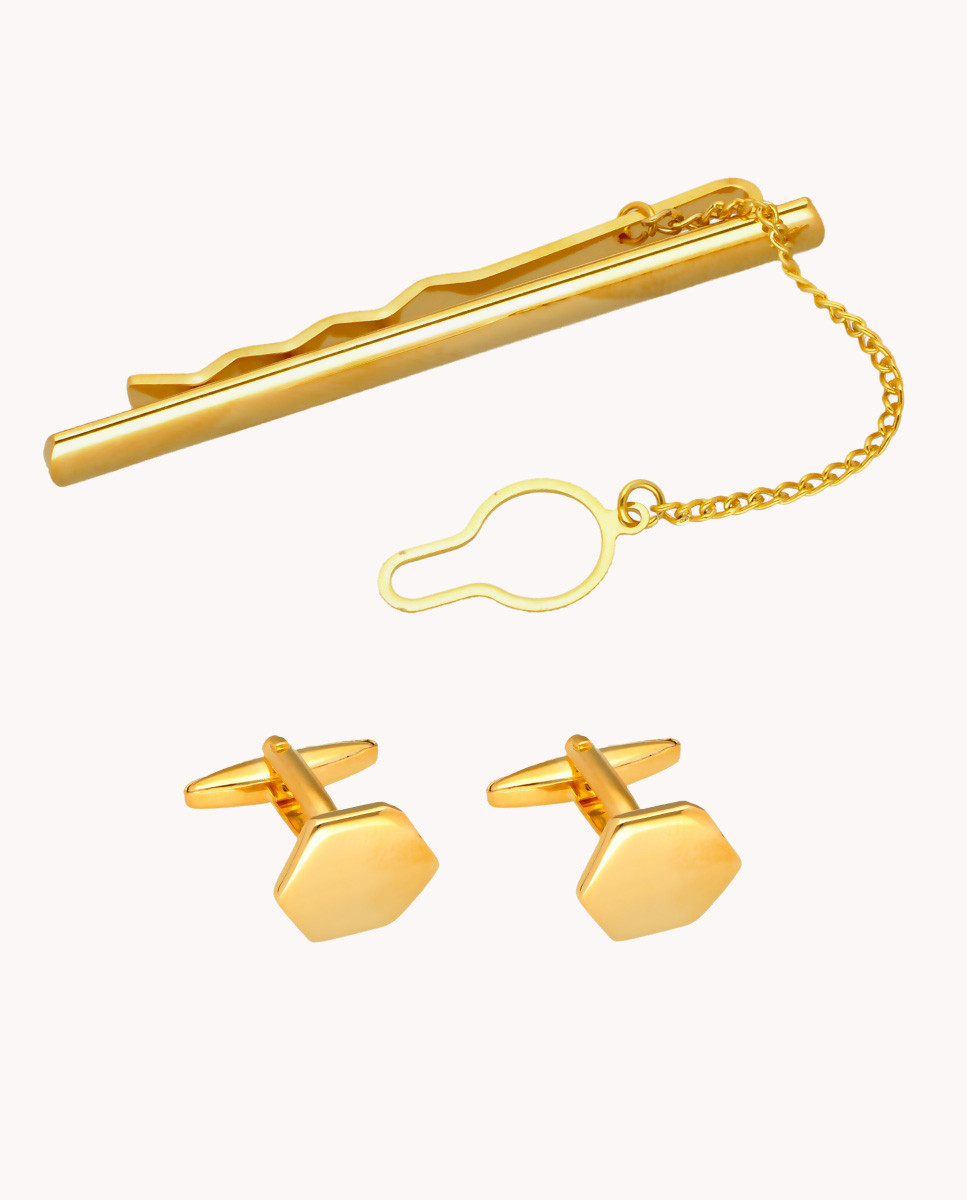 Juego de gemelos y pasador de corbata de metal bañado en oro 18K con terminación brillante. El pasador de corbata es de 6,1 cms x 0,5 cms (largo por ancho) con cadena de seguridad y los gemelos en forma de hexágono de 1,6 x 1,4 cms (ancho por alto).