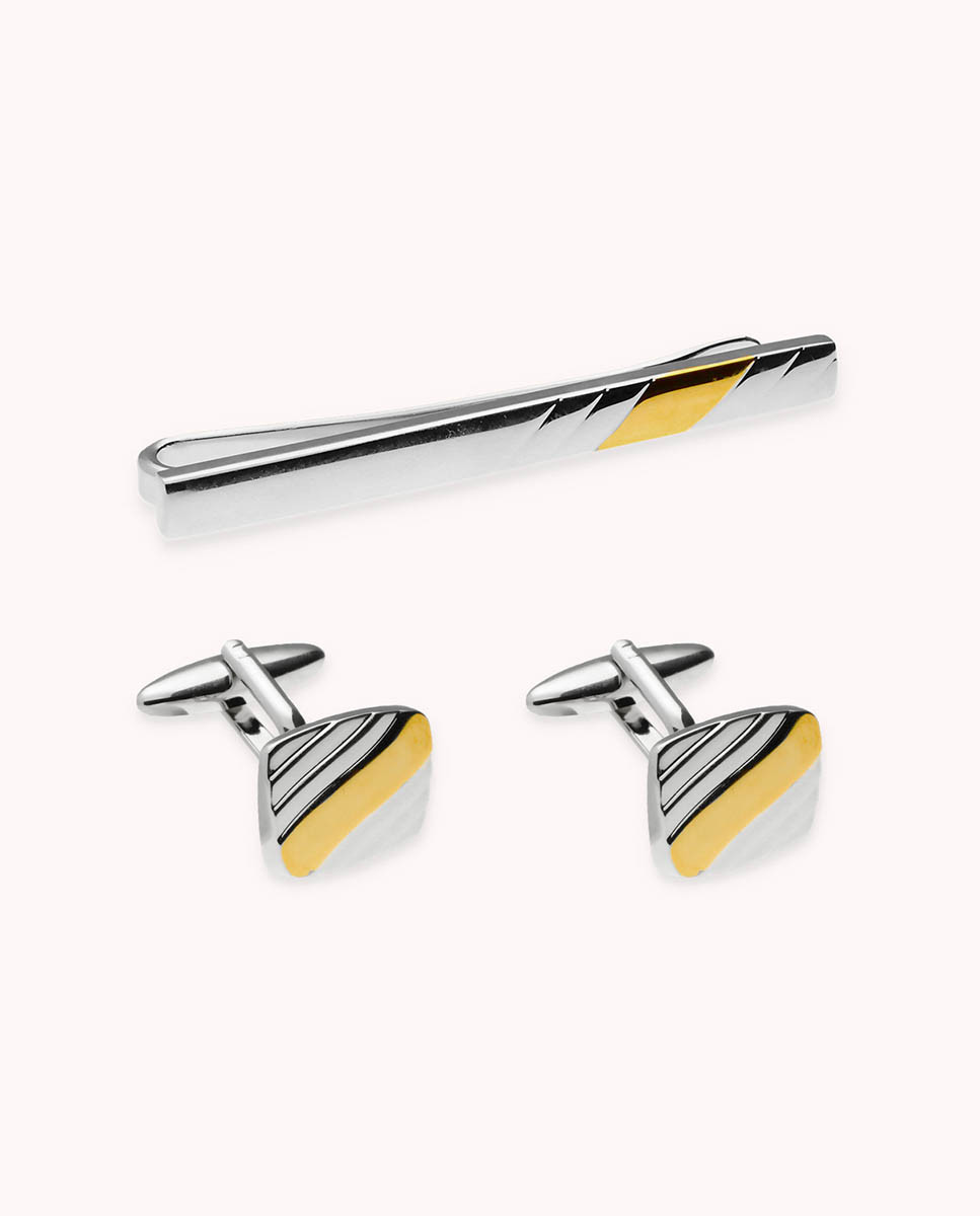 Juego de gemelos y pasador de corbata bicolor (metal rodiado y metal bañado en oro).