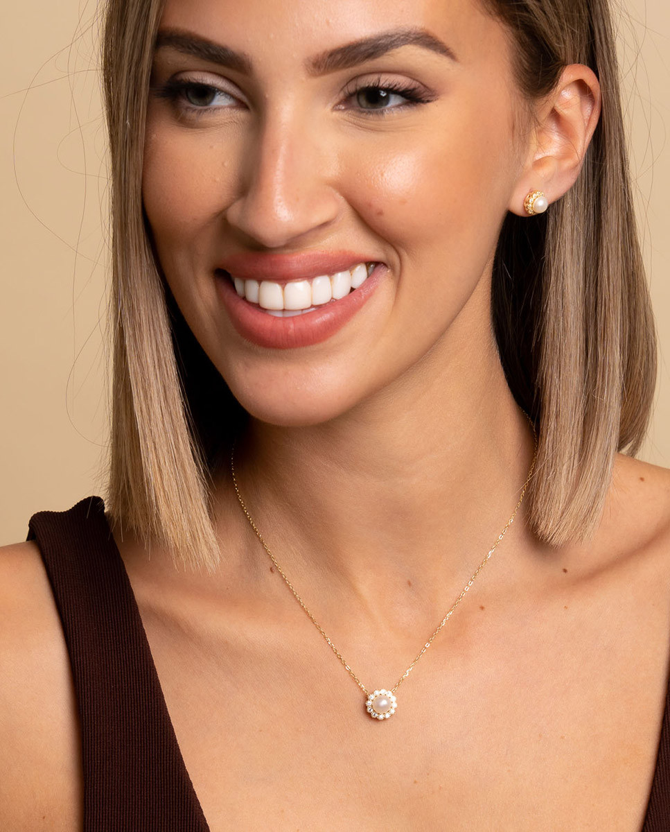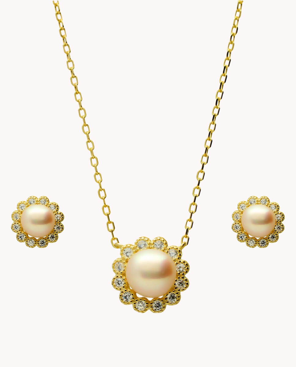 Set de pendientes y colgante flor perla cultivada de plata de ley 925 bañada en oro